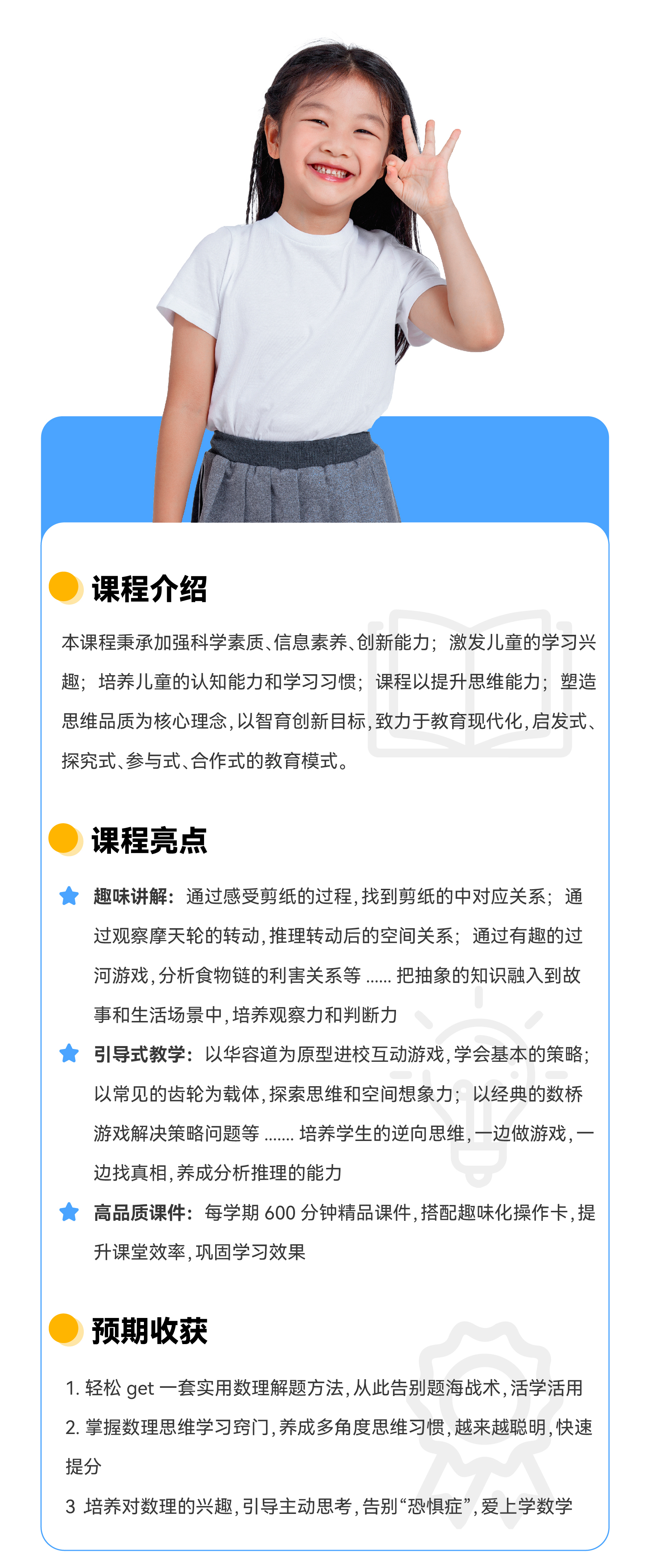 课程简介:本课程秉承加强科学素质、信息素养、创新能力;激发儿童的学习兴趣;培养儿童的认知能力和学习习惯;课程以提升思维能力塑造思维品质为核心理念,以智育创新目标,打造现代化,启发式、探究式、参与式、等多种模式。