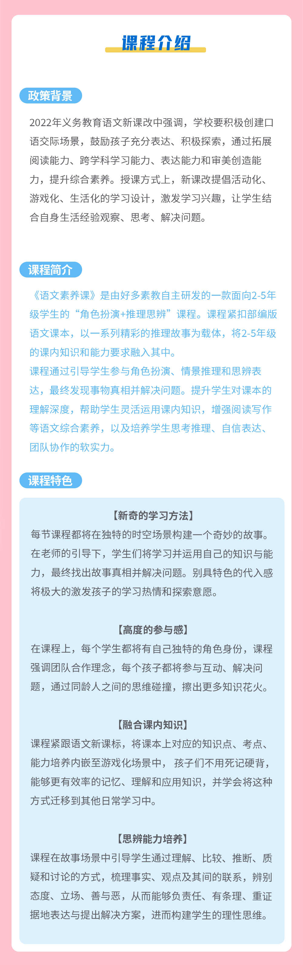 课程简介:语文素养课是由好多素教自主研发的一款面向2-5年级学生的“角色扮演 + 推理思辨”课程。课程紧扣部编版语文课本,以一系列精彩的推理故事为载体,将2-5年级的课内知识和能力要求融入其中。