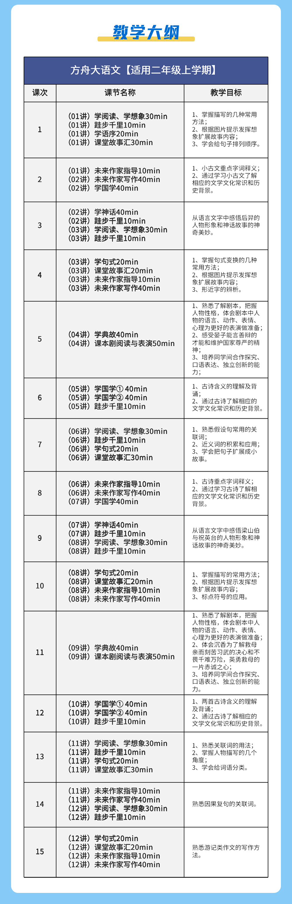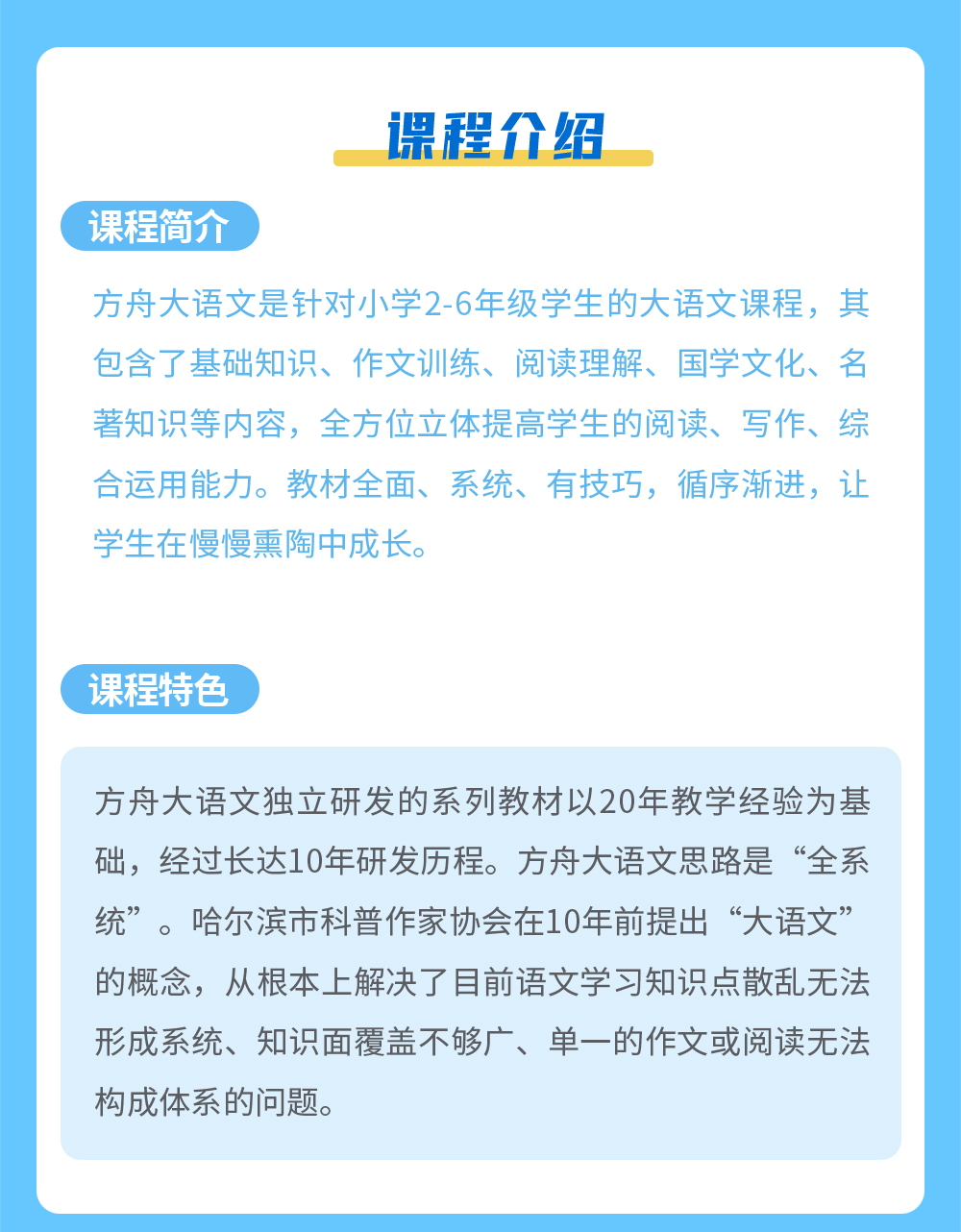 课程简介:方舟大语文是针对小学2-6年级学生的大语文课程,其包含了基础知识、作文训练、阅读理解、国学文化、名著知识等内容,全方位立体提高学生的阅读、写作、综合运用能力。