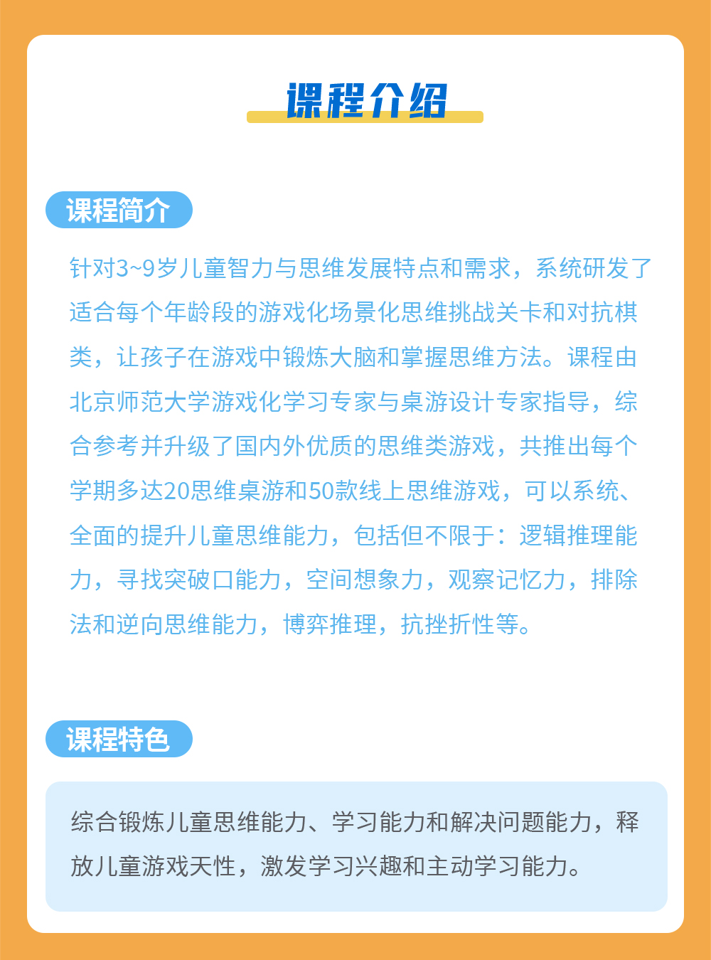课程简介:课程由北京师范大学游戏化学习专家与桌游设计专家指导,采用教具互动、模拟游戏、纸上练习的教学形式,让学生听得进、坐得住、说得出,激发学生的学习热情,全面提升数学思维能力,进而提升解决问题的能力。