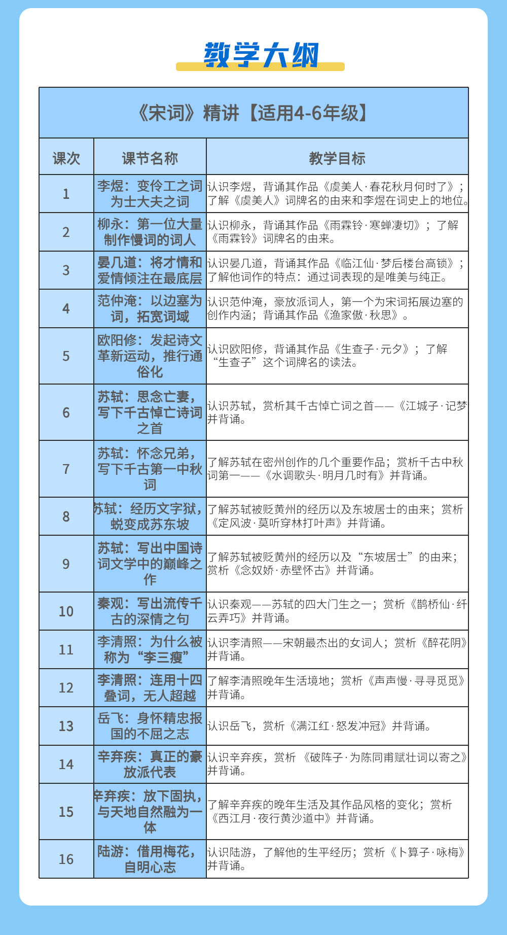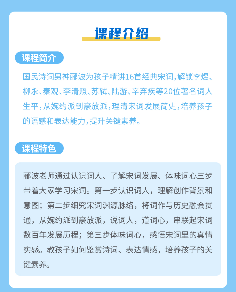 课程简介:国民诗词男神郦波为孩子精讲16首经典宋词,解锁李煜、柳永、秦观、李清照、苏轼、陆游、辛弃疾等20位著名词人生平,从婉约派到豪放派,理清宋词发展简史,培养孩子的语感和表达能力,提升关键素养。