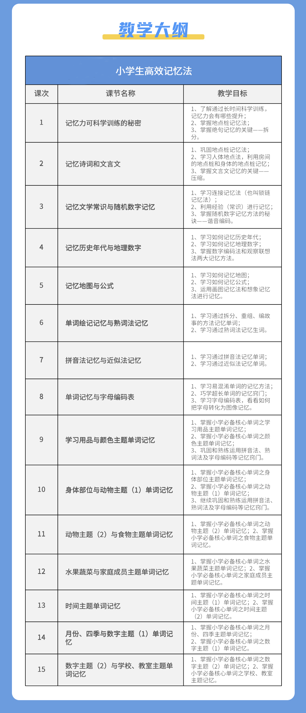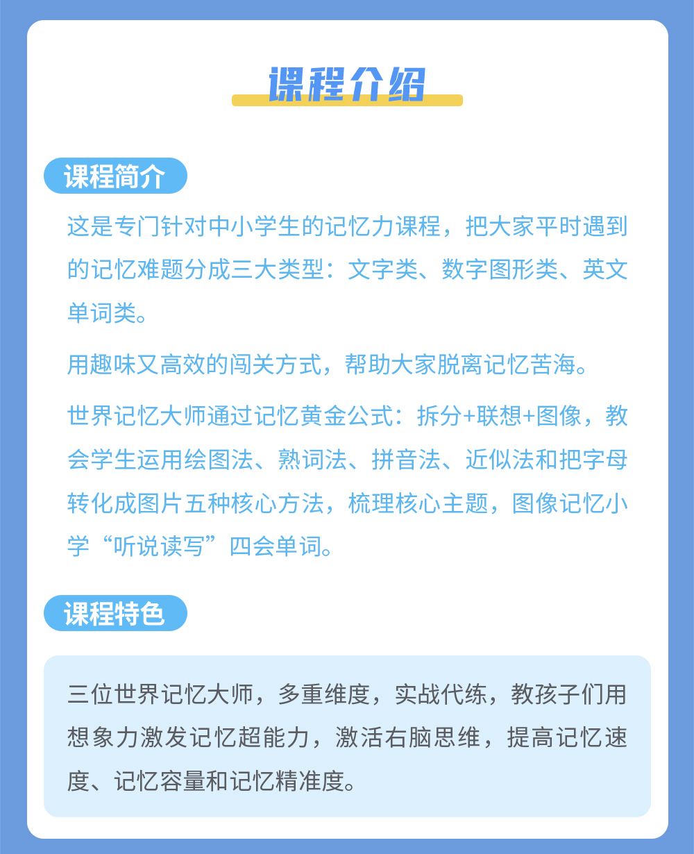 课程简介:这是专门针对中小学生的记忆力课程,把大家平时遇到的记忆难题分成三大类型:文字类、数字图形类、英文单词类。用趣味又高效的闯关方式,帮助大家脱离记忆苦海。