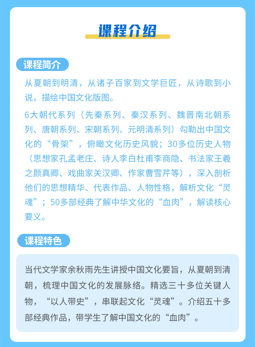 课程简介:6大朝代系列勾勒出中国文化的“骨架”,俯瞰文化历史风貌;30多位历史人物,深入剖析他们的思想精华、代表作品、人物性格,解析文化“灵魂”; 50 多部经典了解中华文化的“血肉”,解读核心要义。