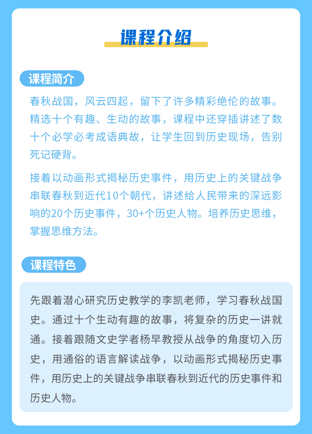 课程简介:春秋战国,风云四起,留下了许多精彩绝伦的故事。精选十个有趣、生动的故事,课程中还穿插讲述了数十个必学必考成语典故,让学生回到历史现场,告别死记硬背。