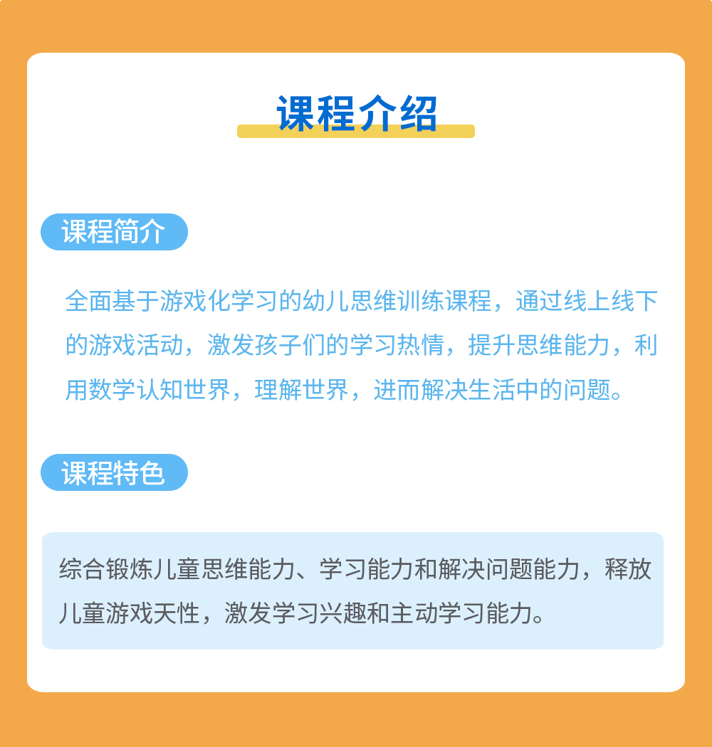课程简介:全面基于游戏化学习的幼儿思维训练课程,通过线上线下的游戏活动,激发孩子们的学习热情,提升思维能力,利用数学认知世界,理解世界,进而解决生活中的问题。,进而提升解决问题的能力。