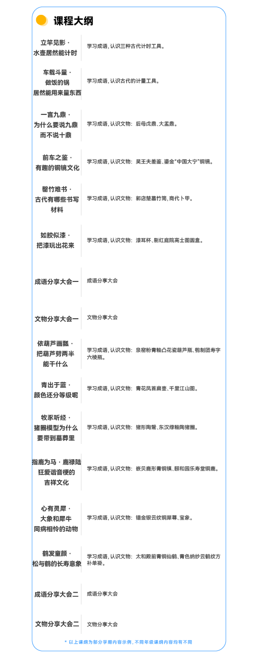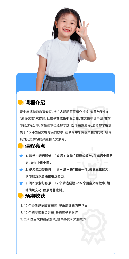 课程简介:青少年博物馆教育专家,推广人朋朋哥哥精心打造,专属与学生的“成语文物”双修课,让孩子在成语中看历史,在文物中讲中国。