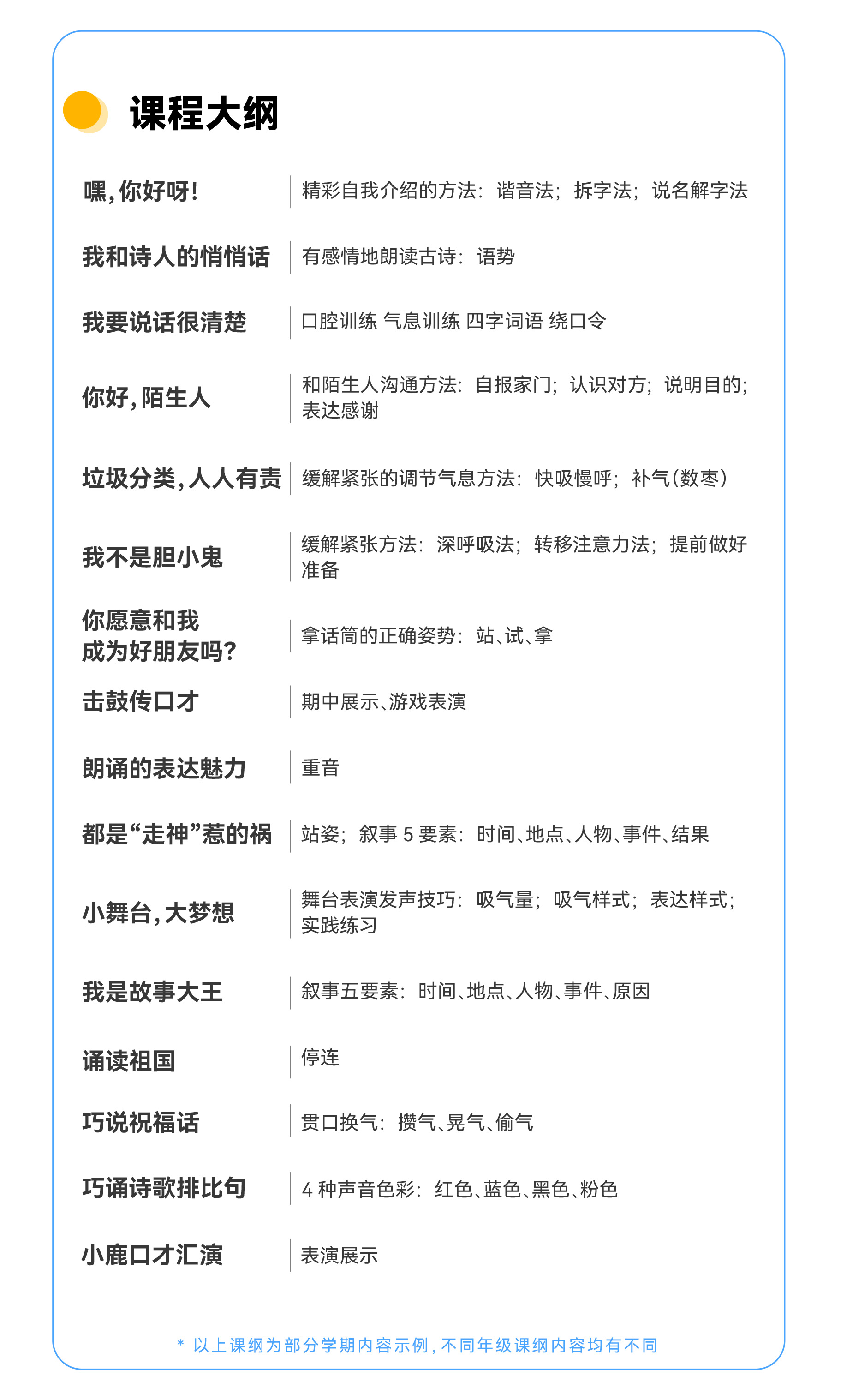 通过专业老师示范、多领域主题、多样化的教学形式,致力于帮助小学生全面提升口才思维和表达能力,让语言表达成为他们生活的一部分,培养他们成为有内容、有方向的口才达人。