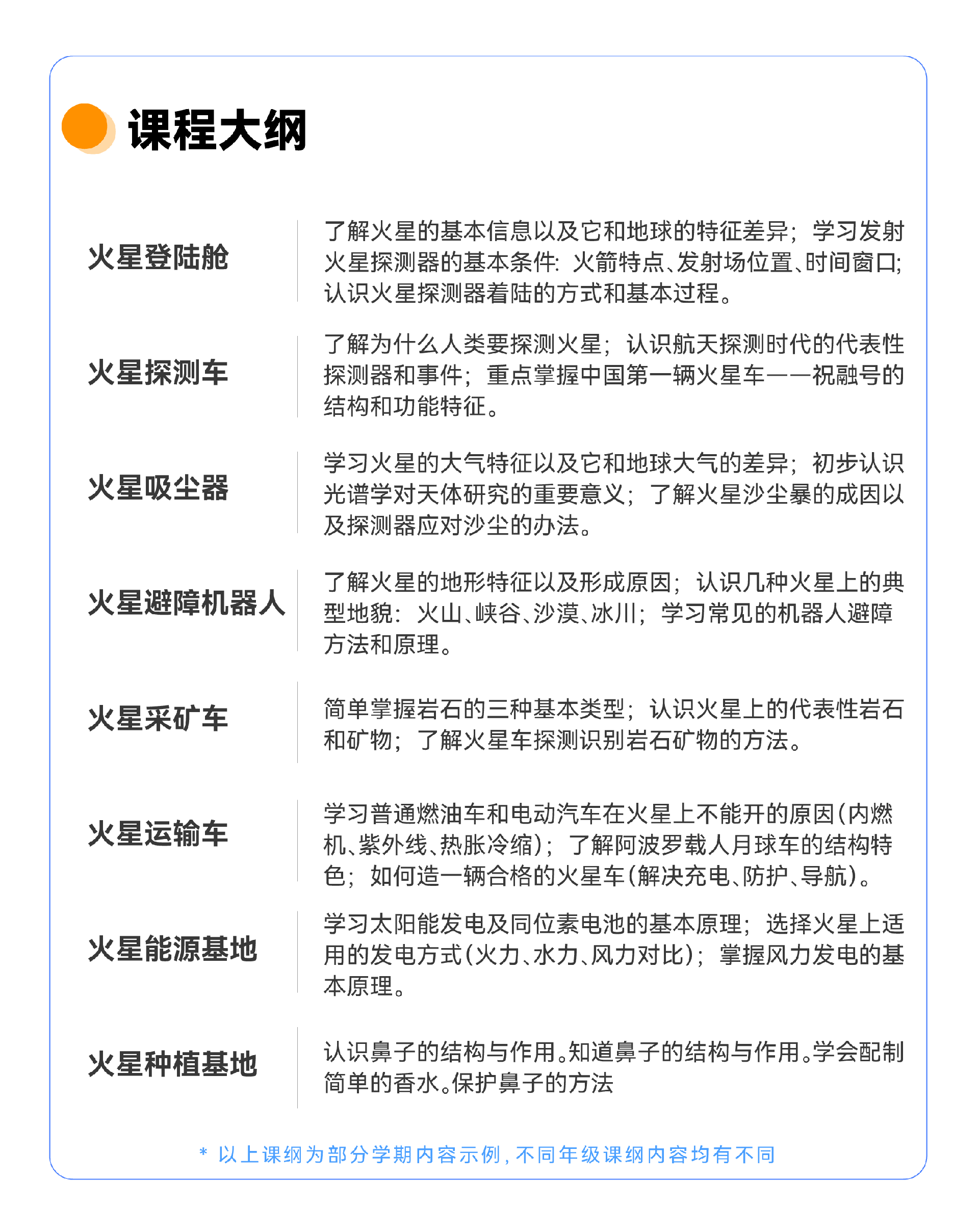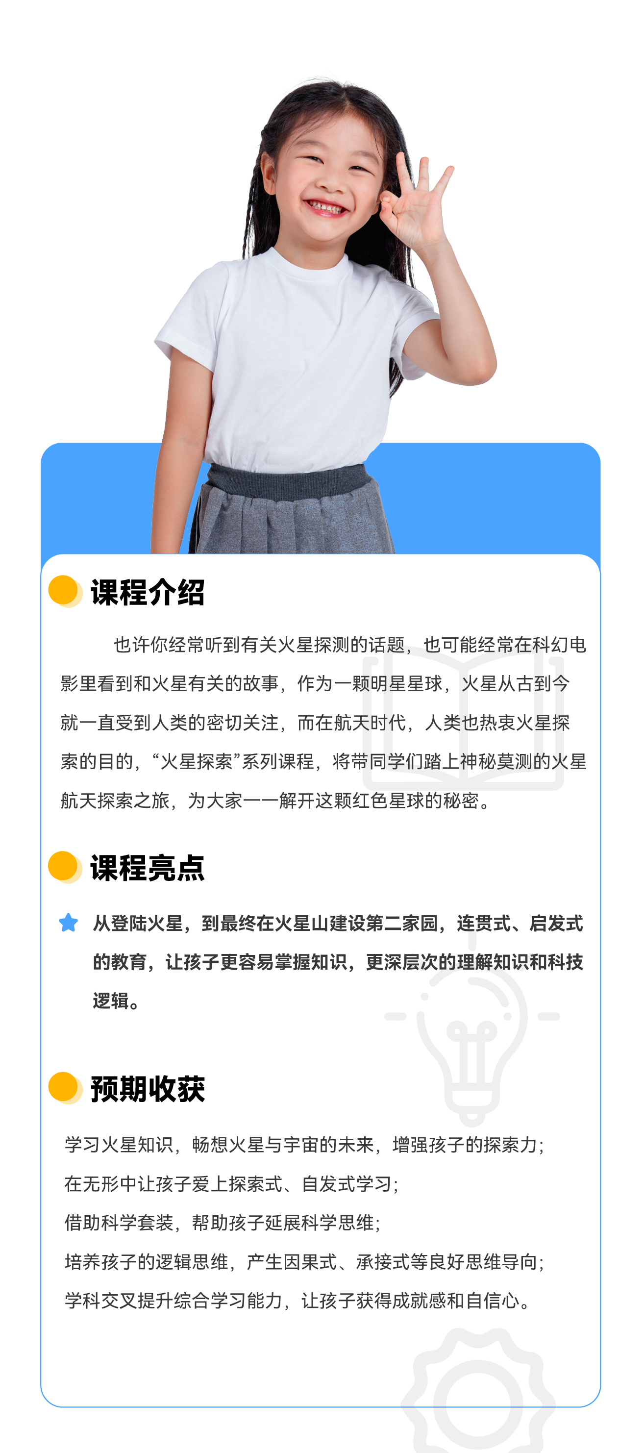 课程简介:从登陆火星,到最终在火星山建设第二家园,连贯式、启发式的教育,让孩子更容易、更深层次的理解知识和科技逻辑。
