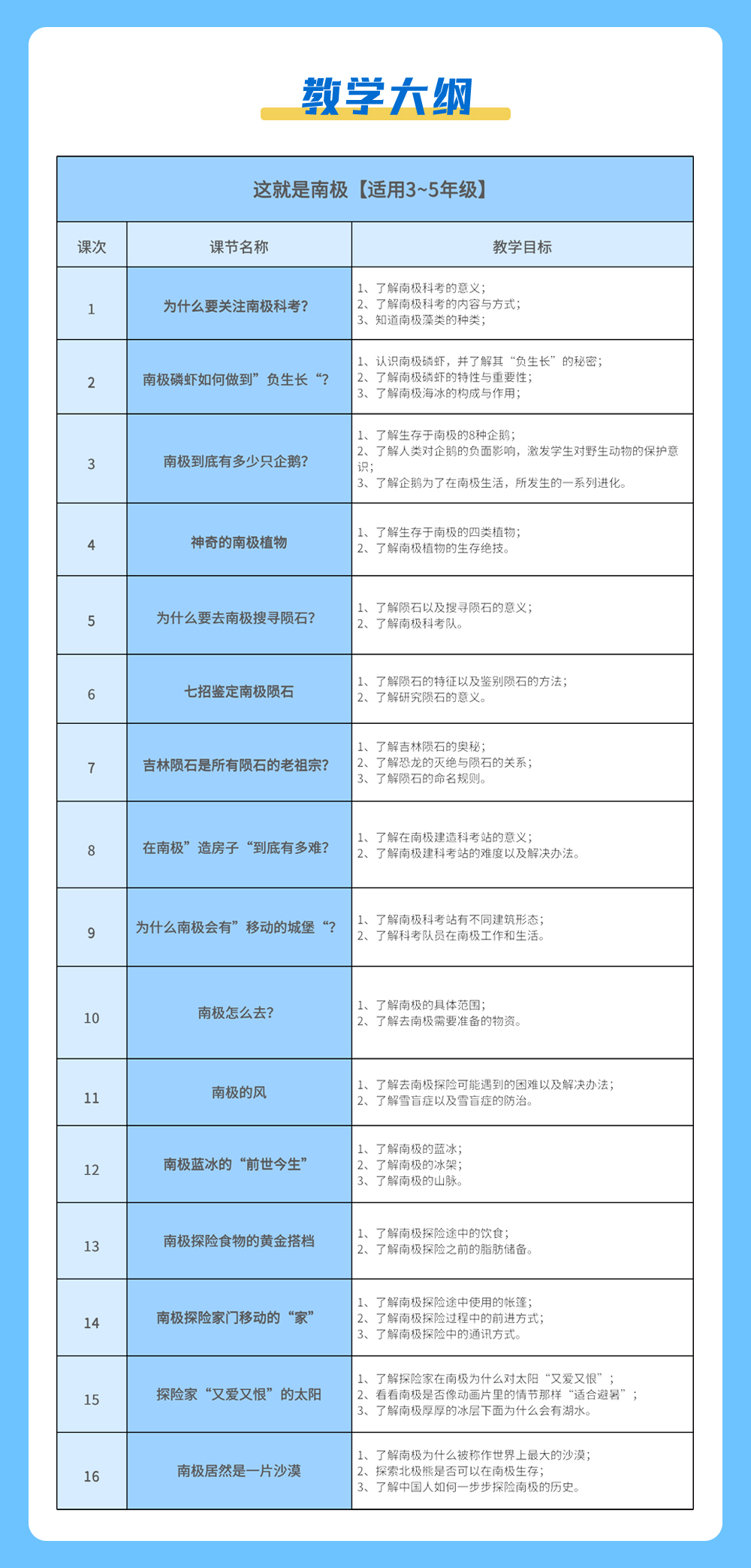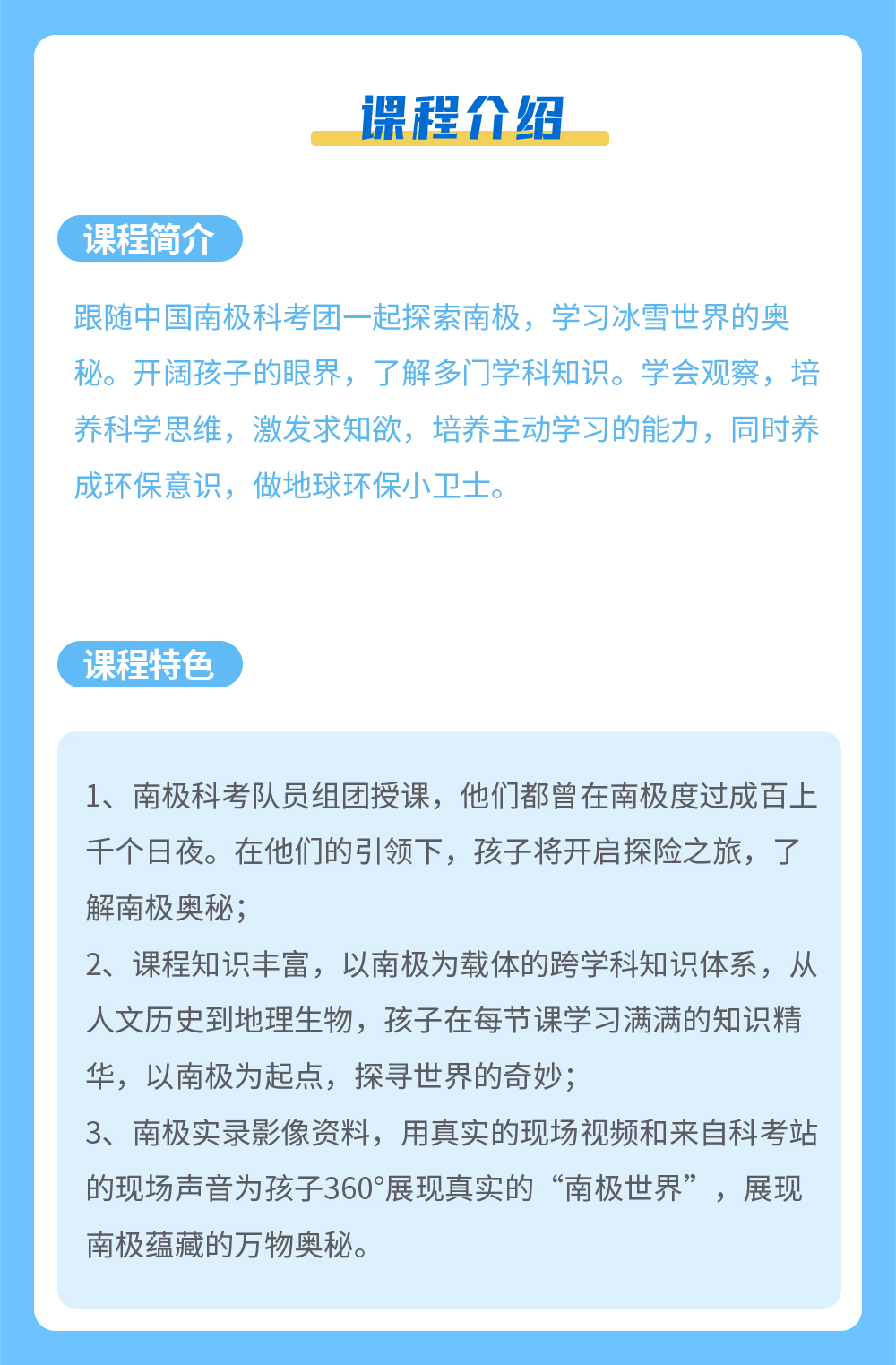 课程简介:跟随中国南极科考团一起探索南极,学习冰雪世界的奥秘。开阔孩子的眼界,了解多门学科知识。学会观察,培养科学思维,激发求知欲,培养主动学习的能力,同时养成环保意识,做地球环保小卫士。