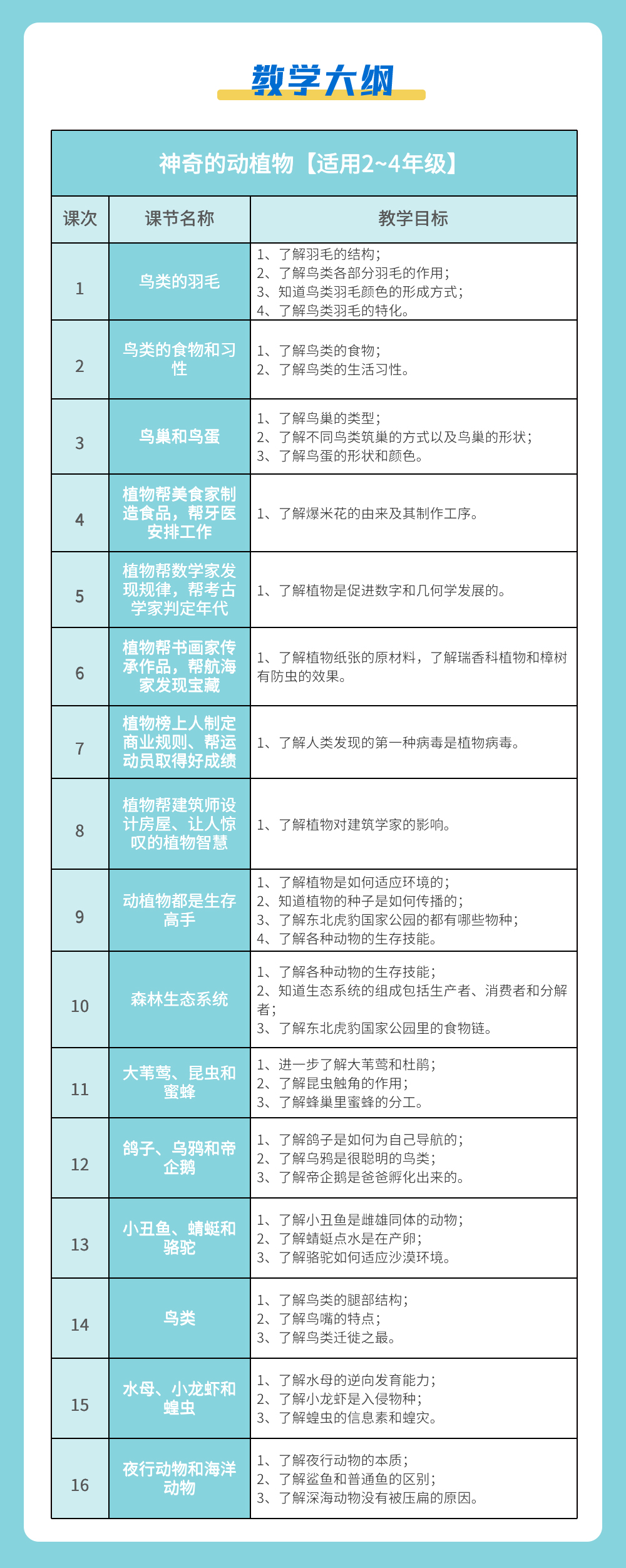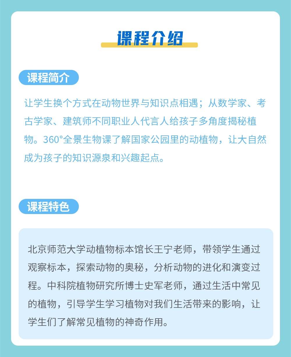 课程简介:让学生换个方式在动物世界与知识点相遇;从数学家、考古学家、建筑师不同职业人代言人给孩子多角度揭秘植物。360°全景生物课了解国家公园里的动植物,让大自然成为孩子的知识源泉和兴趣起点。