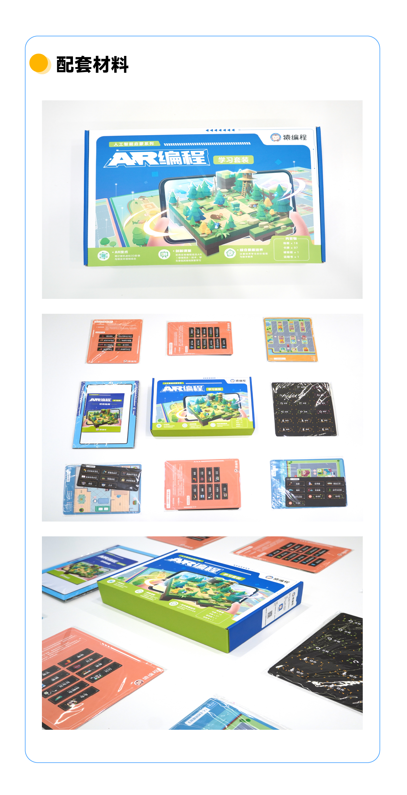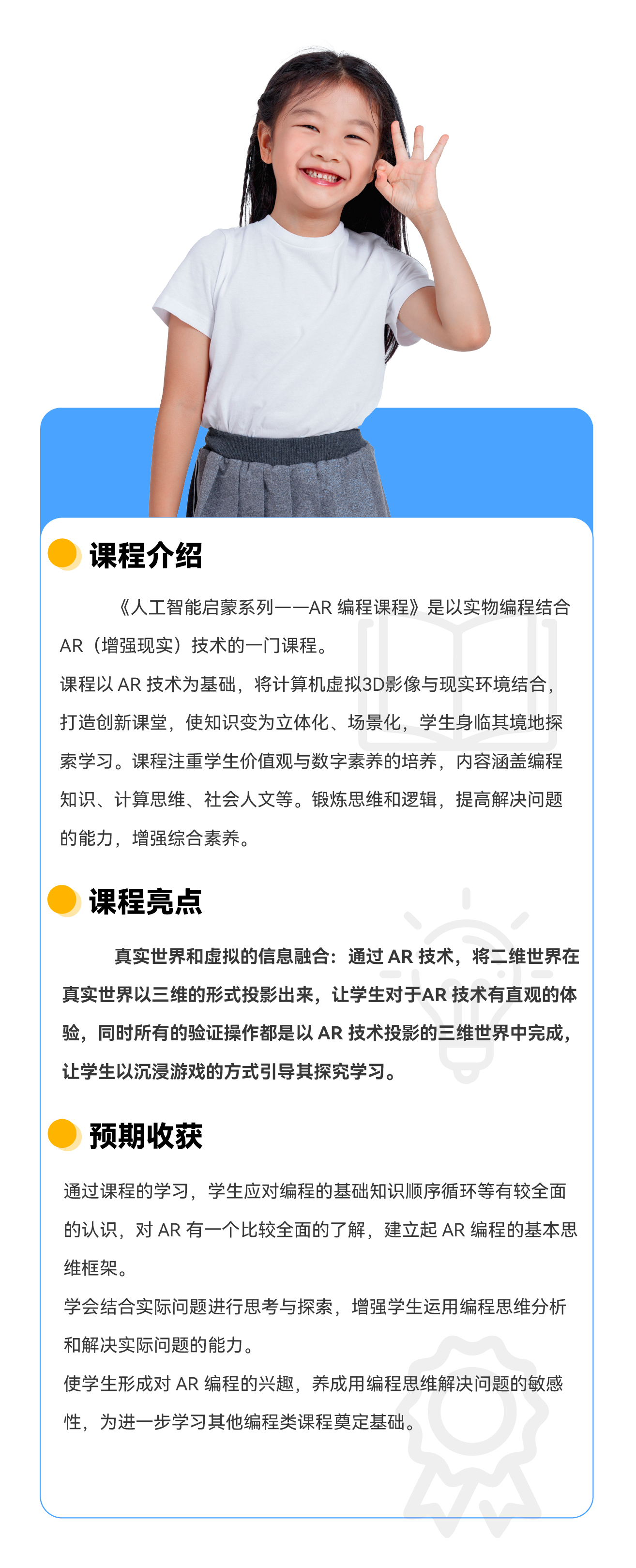 课程简介:《AR 编程课程》以实物编程结合 AR(增强现实)技术的一门课程。 课程以 AR 技术为基础,将计算机虚拟3D影像与现实环境结合,打造创新课堂,使知识变为立体化、场景化,学生身临其境地探索学习。