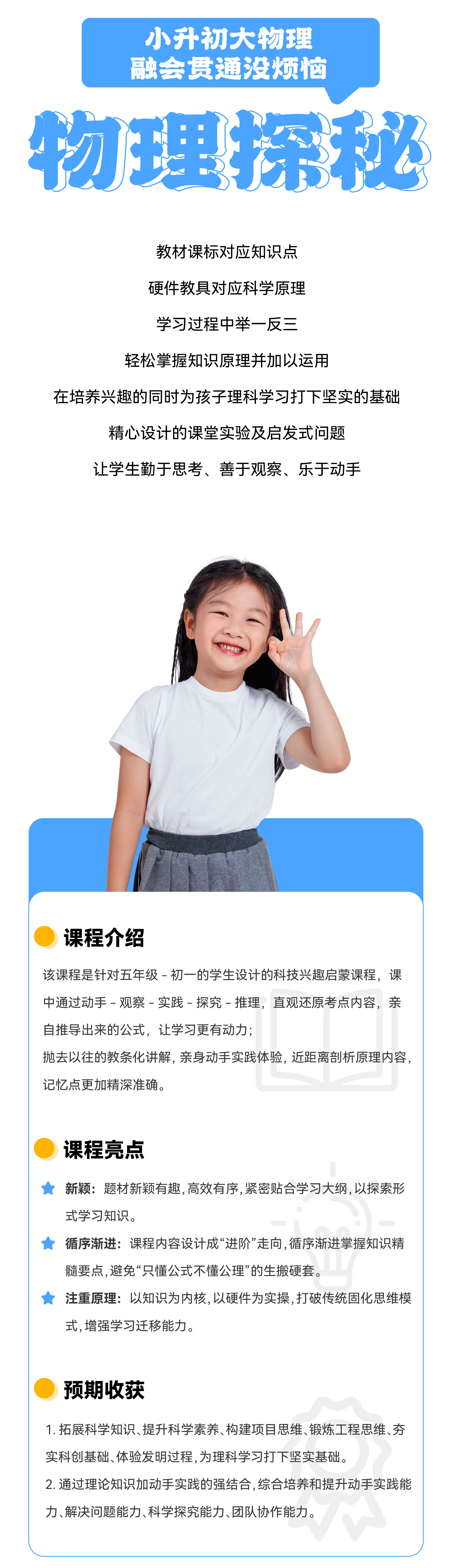 课程简介:该课程是针对五年级-初一的学生设计的科技兴趣启蒙课程,课中通过动手-观察-实践-探究-推理,直观还原考点内容,亲自推导出来的公式,让学习更有动力。