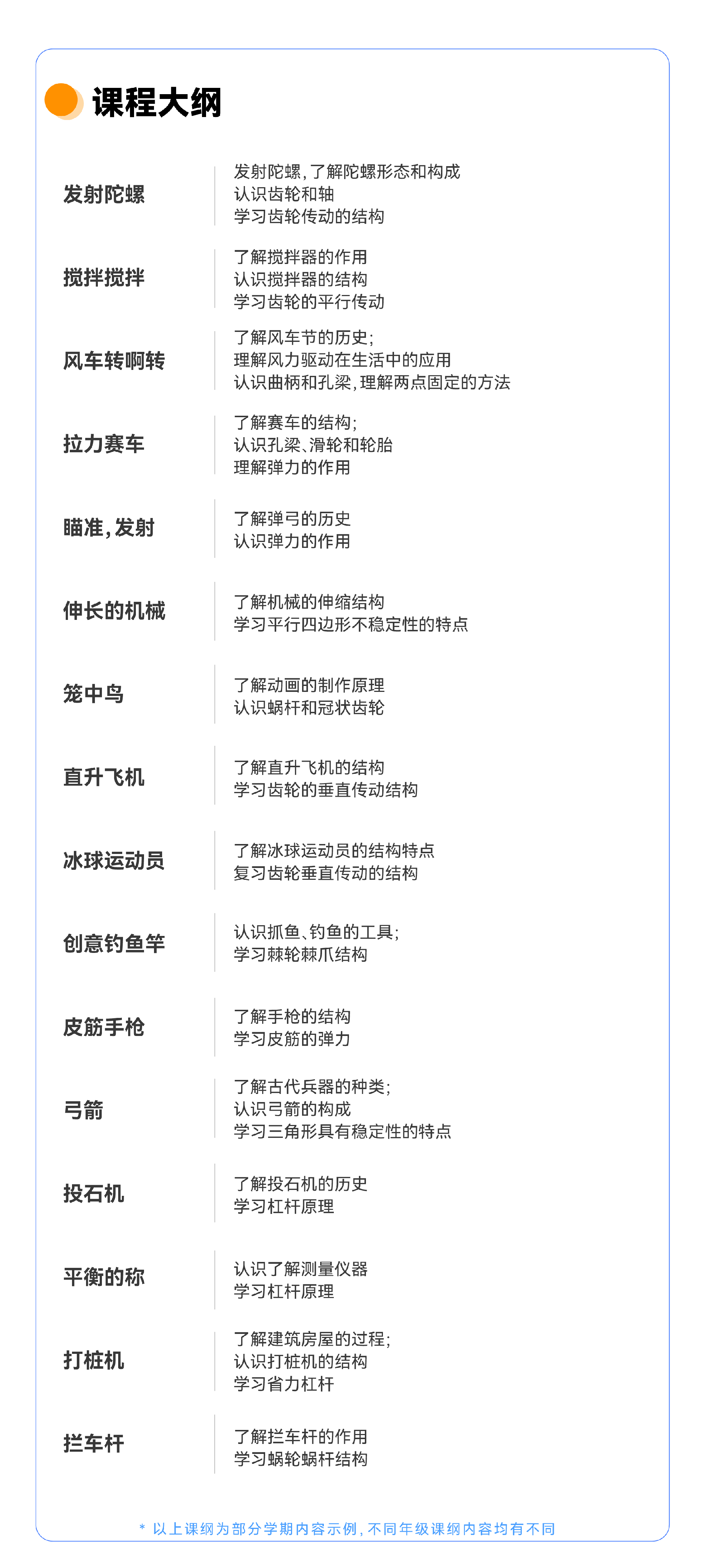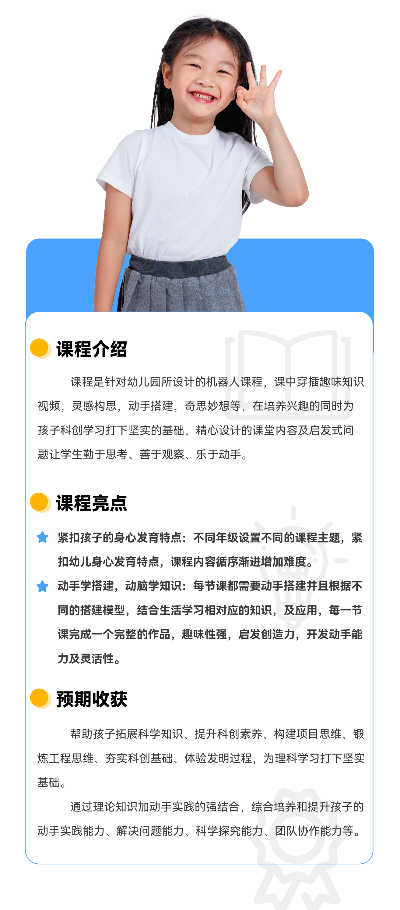 课程简介:课程穿插趣味知识视频,灵感构思,动手搭建,奇思妙想等,在培养兴趣的同时为孩子科创学习打下坚实的基础,精心设计的课堂内容及启发式问题让学生勤于思考、善于观察、乐于动手。