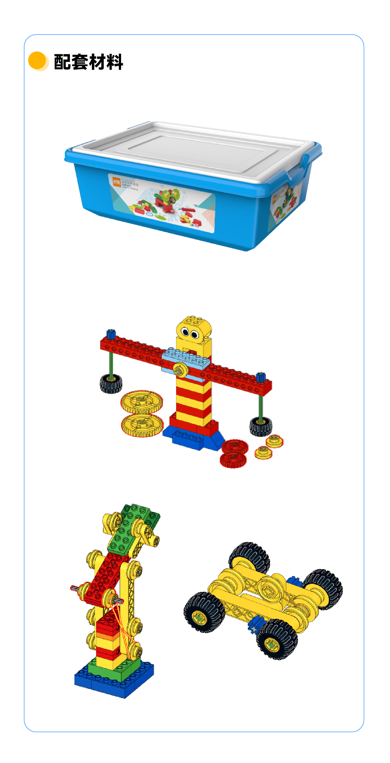动手学搭建,动脑学知识:每节课都需要动手搭建并且根据不同的搭建模型,结合生活学习相对应的知识及应用,每一节课完成一个完整的作品,趣味性强,启发创造力,开发动手能力及灵活性。