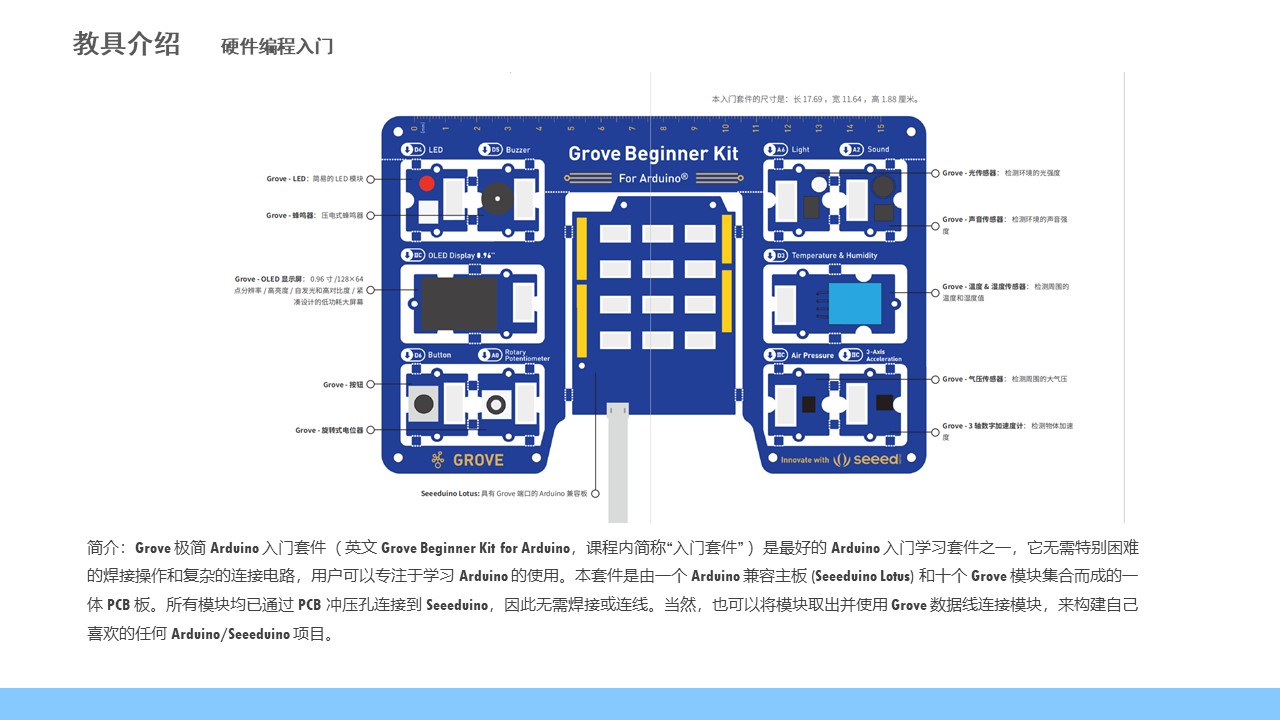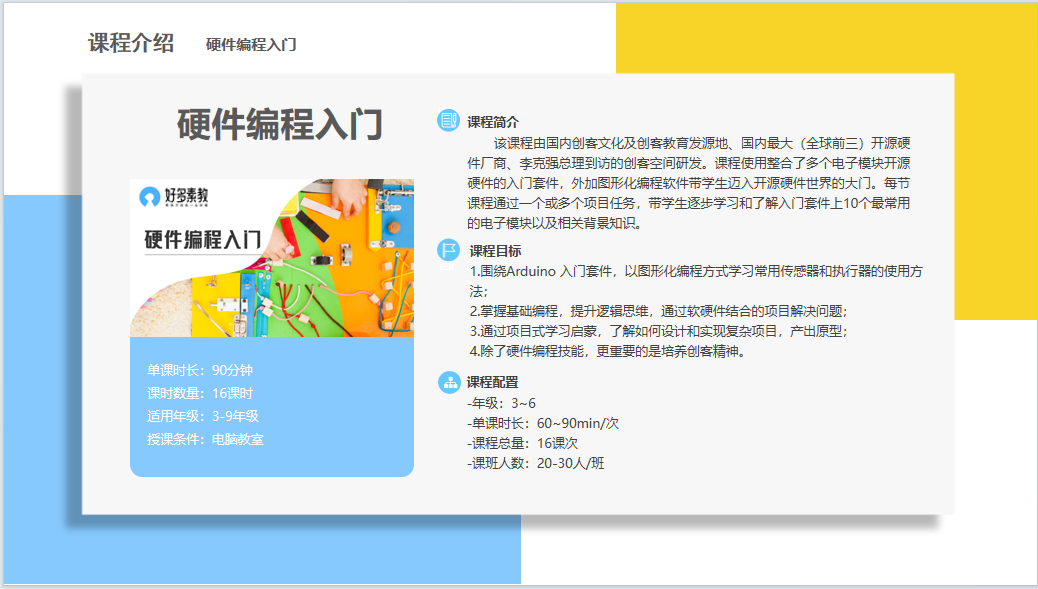 课程简介:该课程使用整合了多个电子模块开源硬件的入门套件,外加图形化编程软件带学生迈入开源硬件世界的大门。每节课程通过一个或多个项目任务,带学生逐步学习和了解入门套件上10个最常用的电子模块以及相关背景知识。