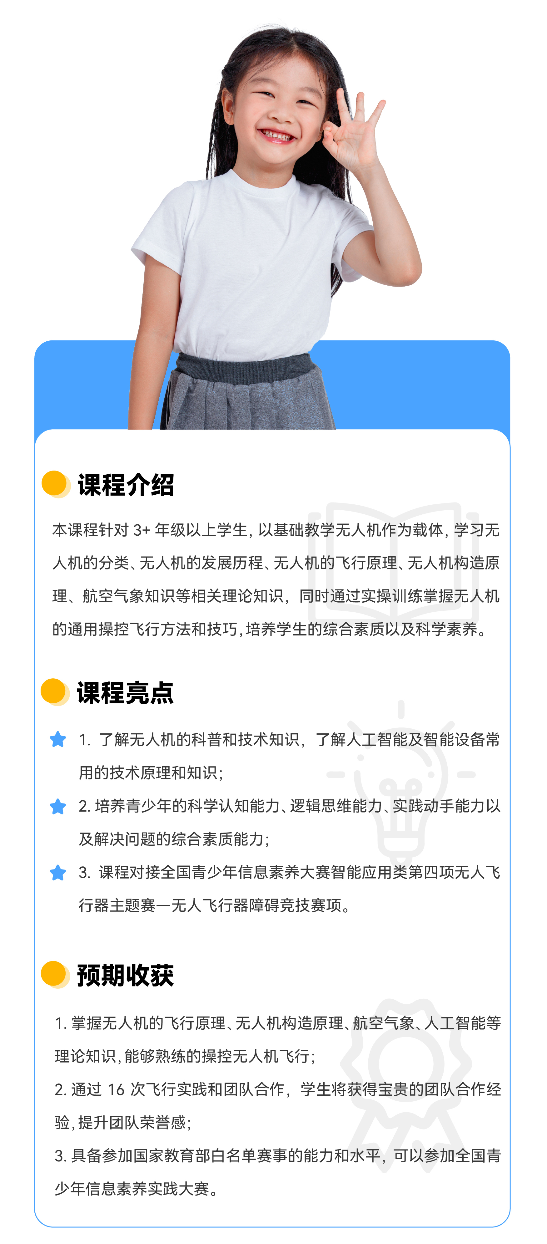 地方比赛套件,包括无人机的分类、无人机发展史、无人机的飞行原理、无人机构造原理、模拟器练习、航空气象知识、无人机赛事介绍等。