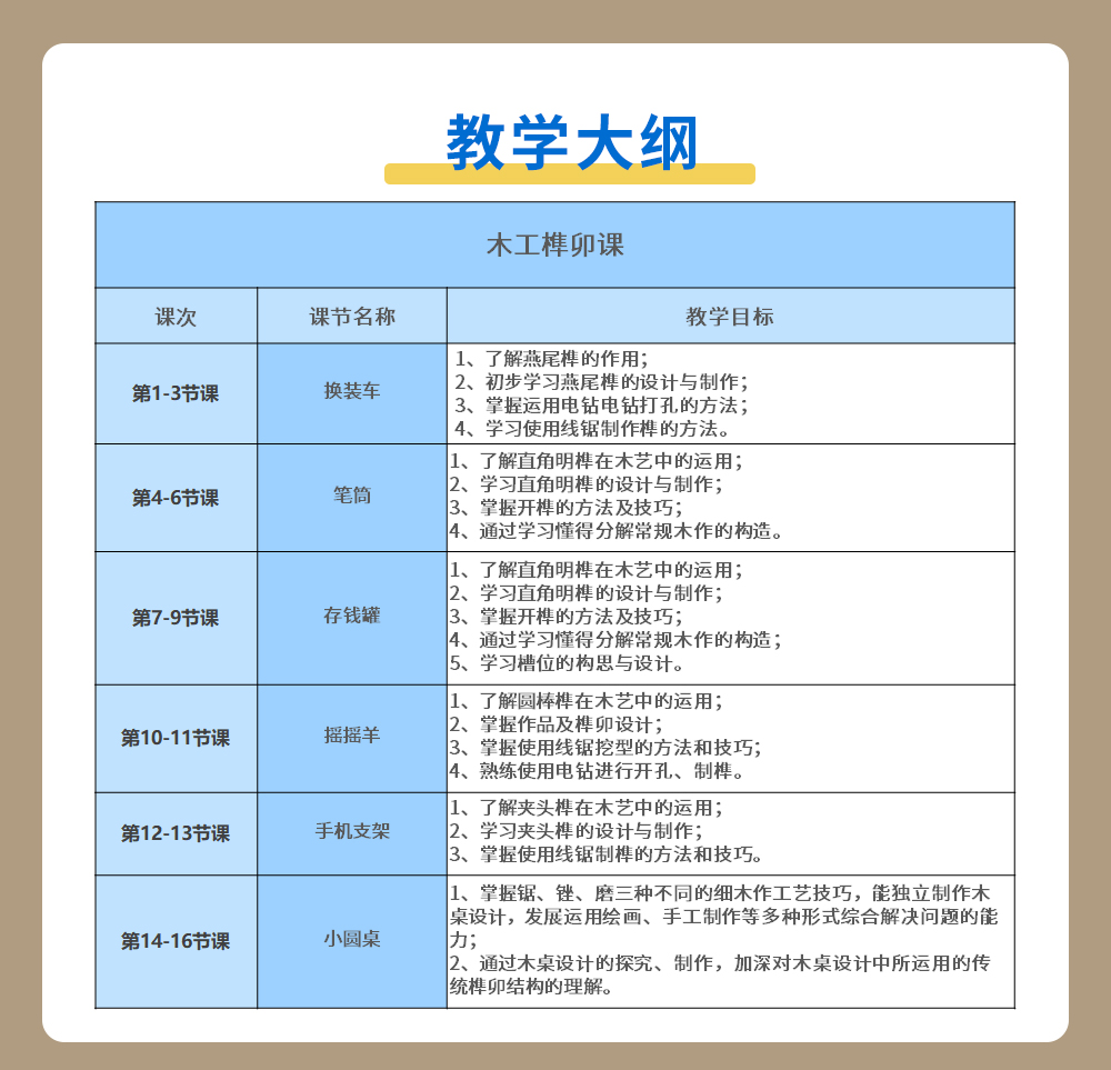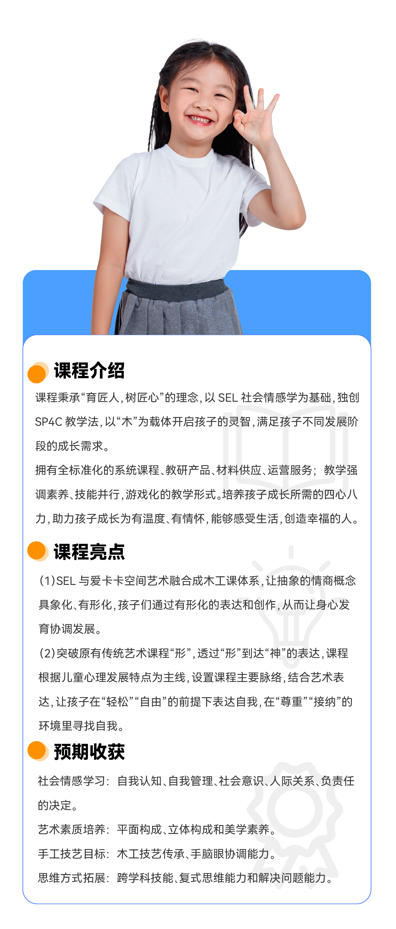 以木为载体,以SEL社会情感学为基础的立体艺术教育;教学强调榫卯结构与传统文化素养、技能并行,育匠人、树匠心。
