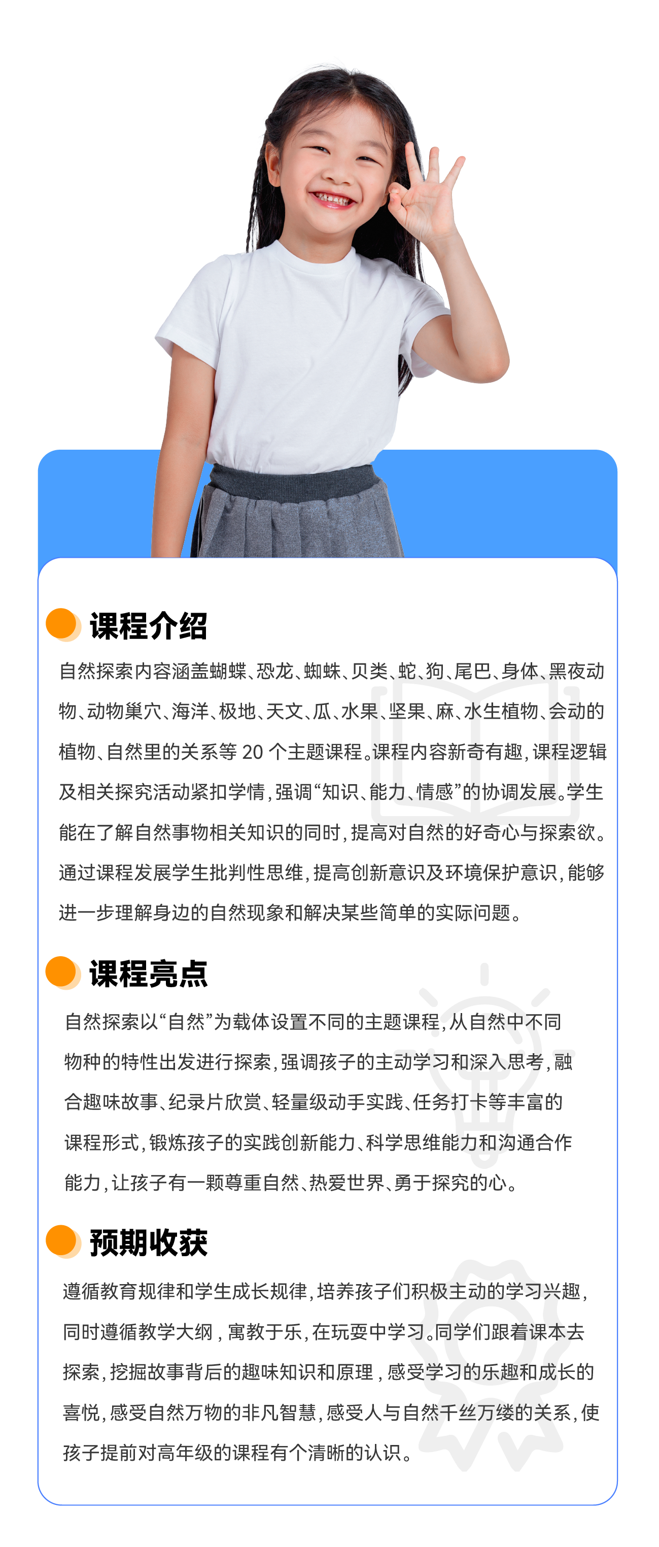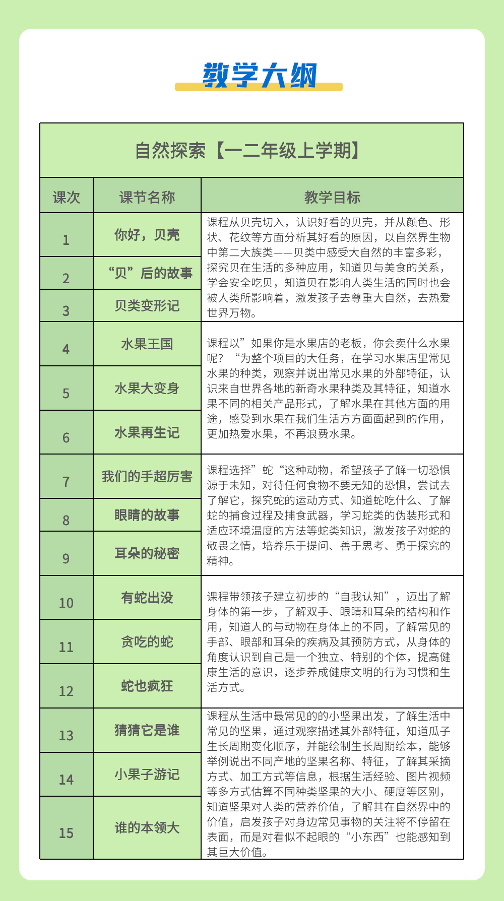 课程简介:课程带领孩子了解自然,获取自然知识,体验大自然的美。课程内容新奇有趣,课程逻辑及相关探究活动紧扣学情,强调“知识、能力、情感”的协调发展。