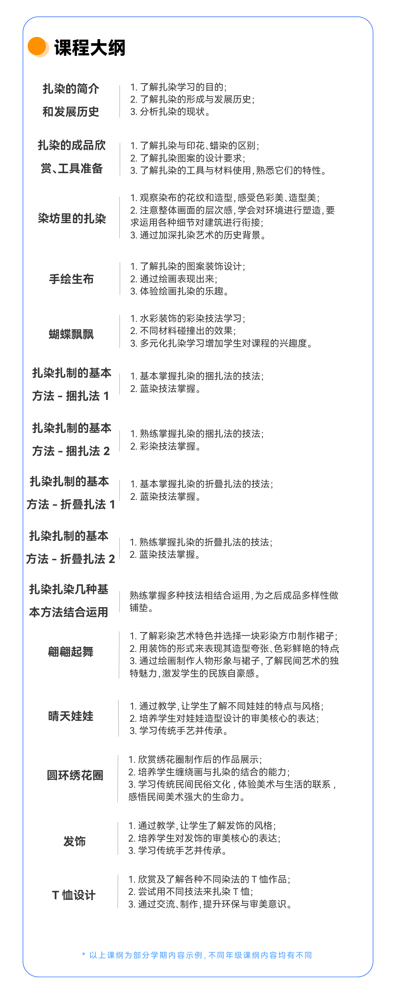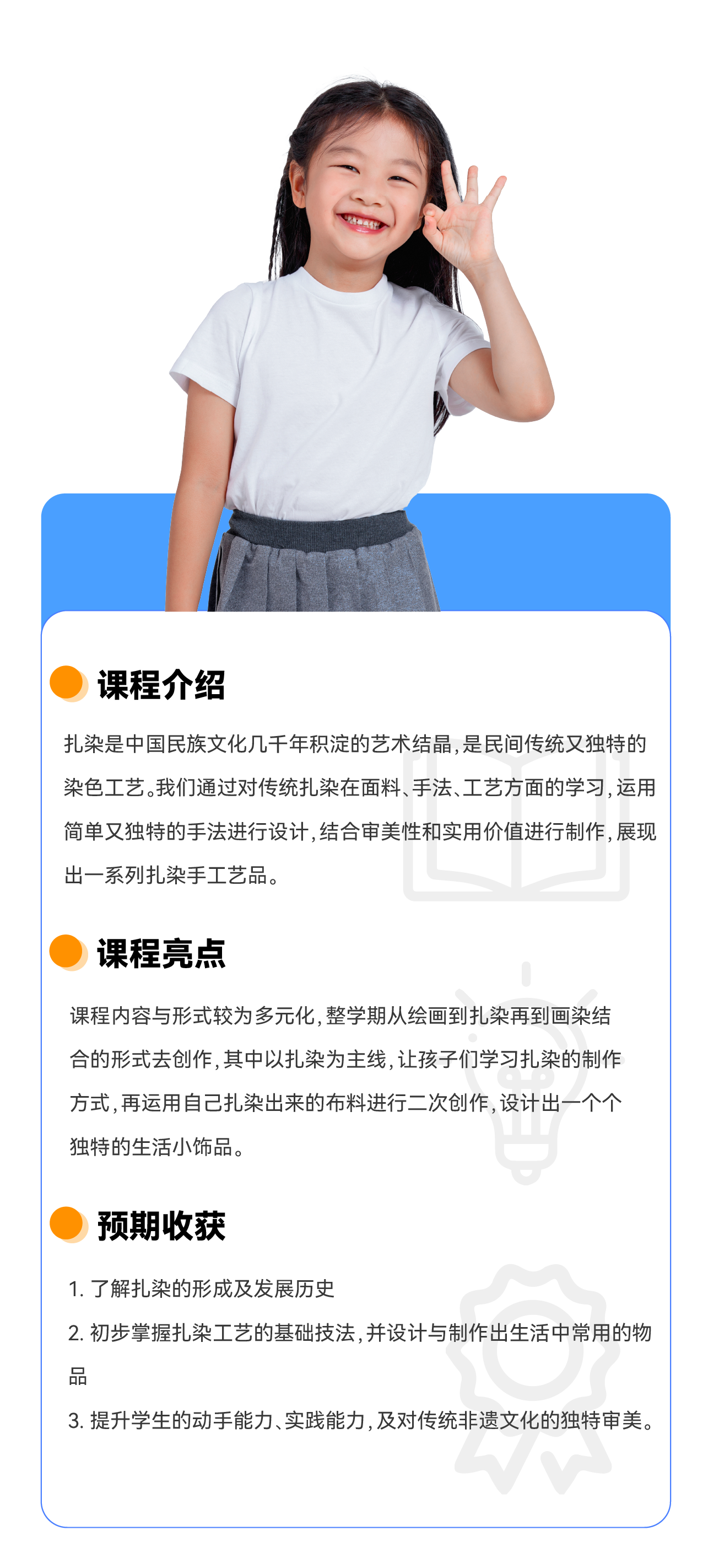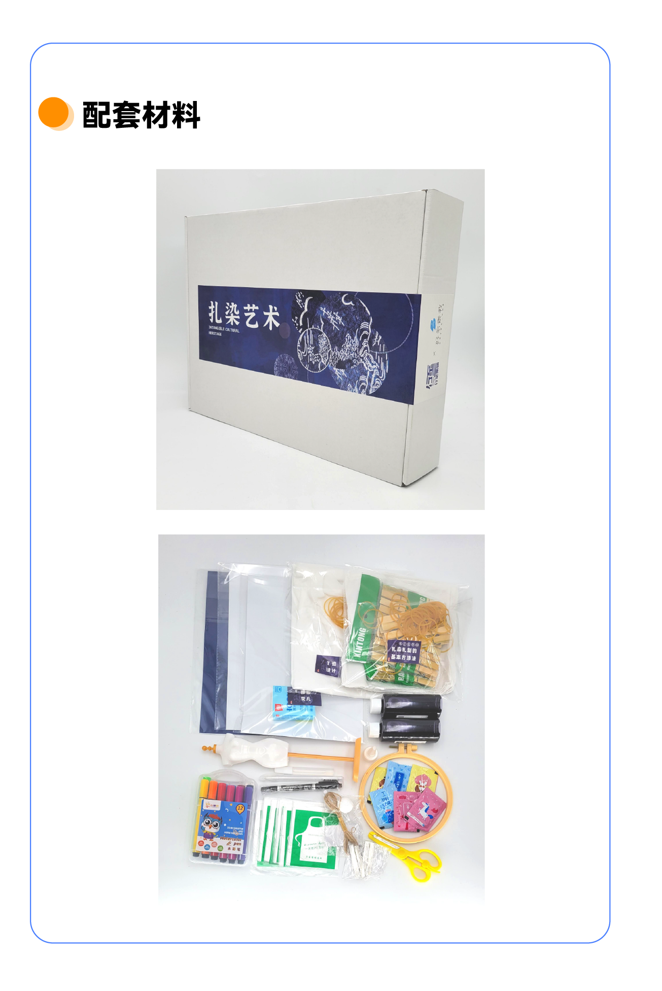 课程简介:扎染是中国民族文化几千年积淀的艺术结晶,是民间传统又独特的染色工艺。我们通过对传统扎染在面料、手法、工艺方面的学习,运用简单又独特的手法进行设计,结合审美性和实用价值进行制作,展现出一系列扎染手工艺品