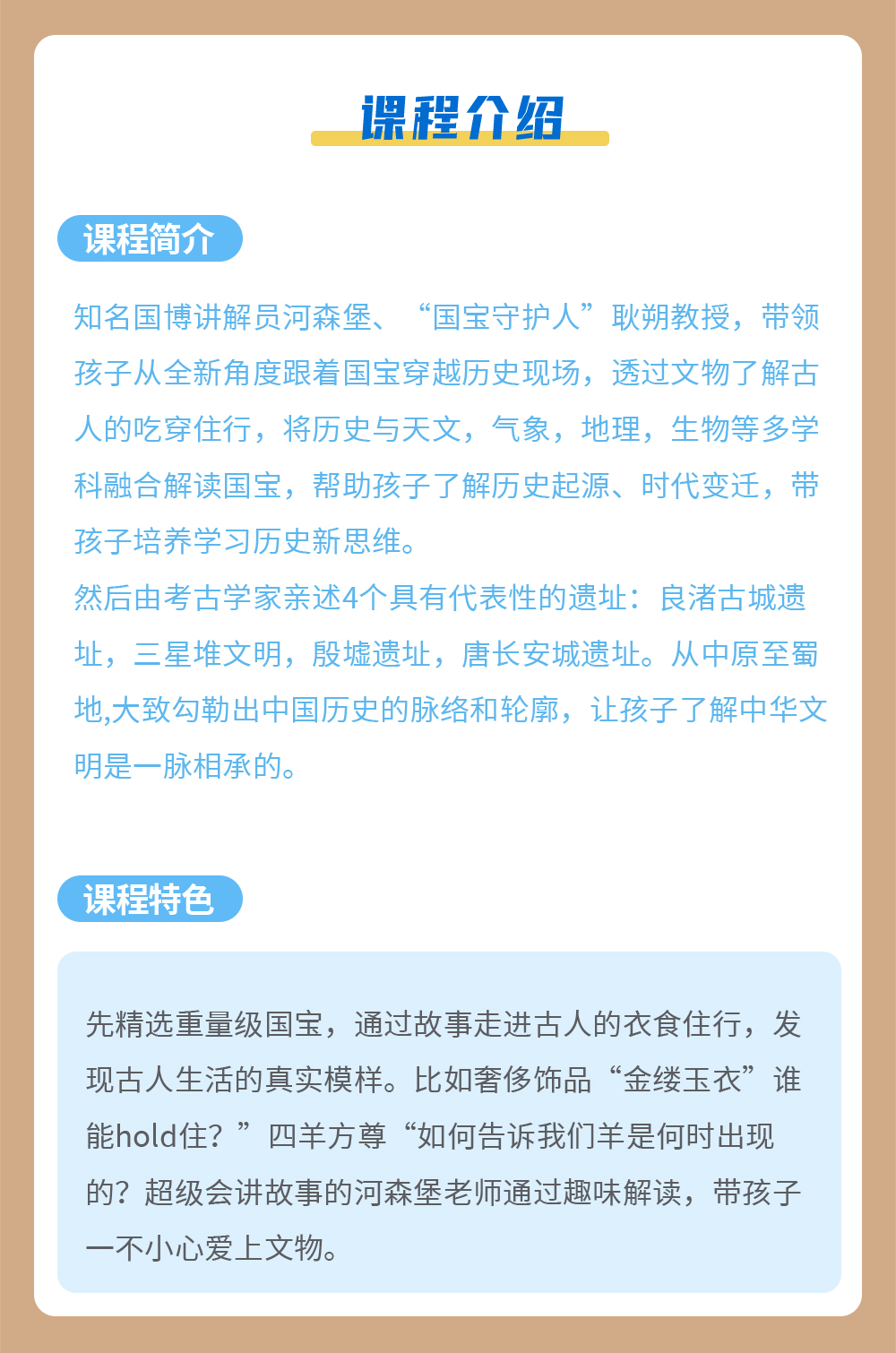 课程简介:知名国博讲解员河森堡、“国宝守护人”耿朔教授,带领孩子从全新角度跟着国宝穿越历史现场,透过文物了解古人的吃穿住行,将历史与天文,气象,地理,生物等多学科融合解读国宝,帮助孩子了解历史起源、时代变迁。