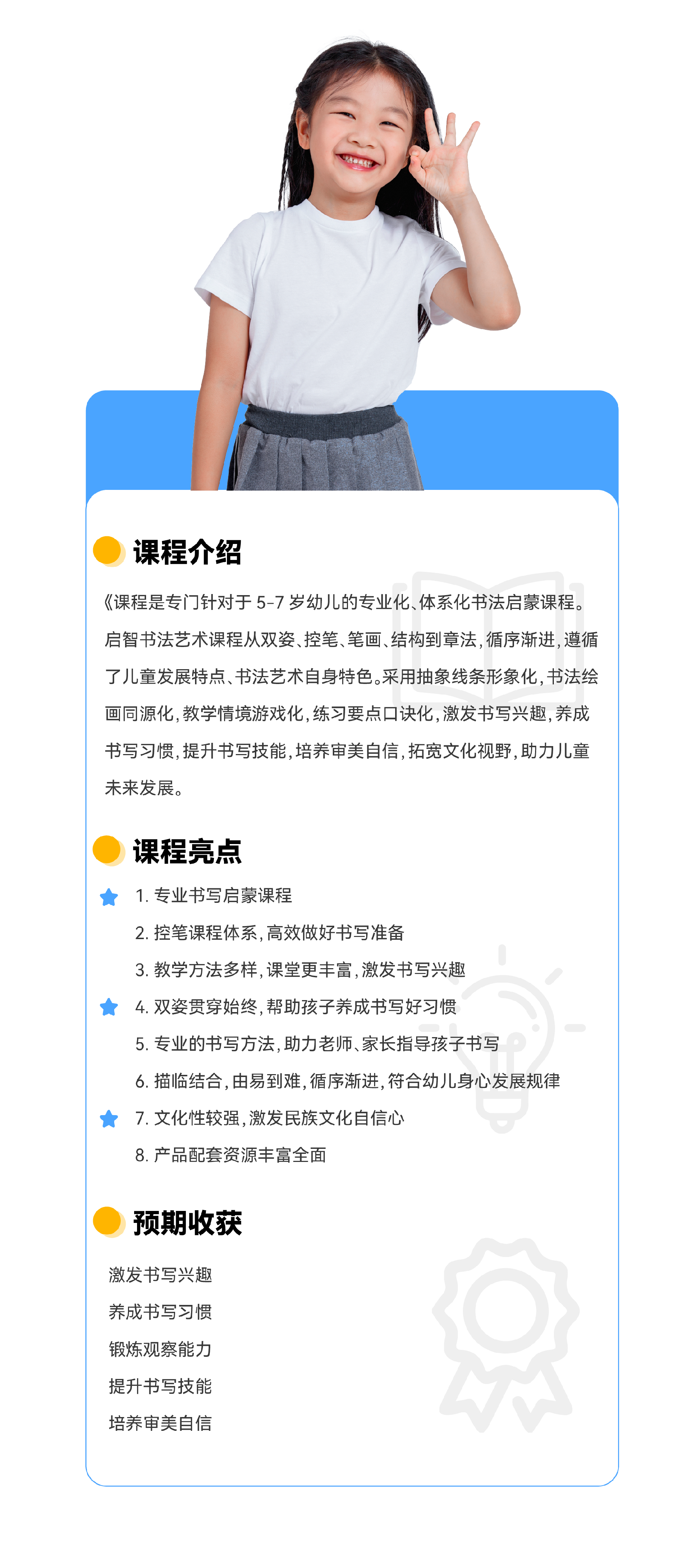 课程简介:课程是专门针对于5-7岁幼儿的专业化、体系化书法启蒙课程。 启智书法艺术课程从双姿、控笔、笔画、结构到章法,循序渐进,遵循了儿童发展特点、书法艺术自身特色。