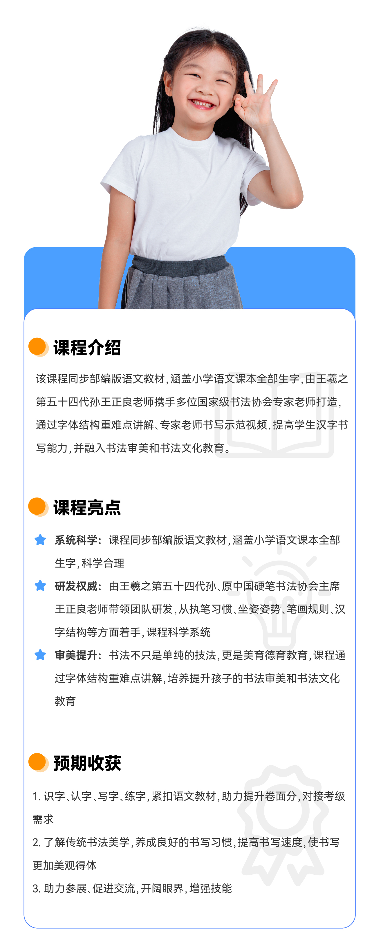 课程简介:课程同步部编版语文教材,涵盖小学语文课本全部生字,由王羲之第五十四代孙王正良老师携手多位国家级书法协会专家老师打造,通过字体结构重难点讲解、专家老师书写示范视频,提高学生汉字书写能力。