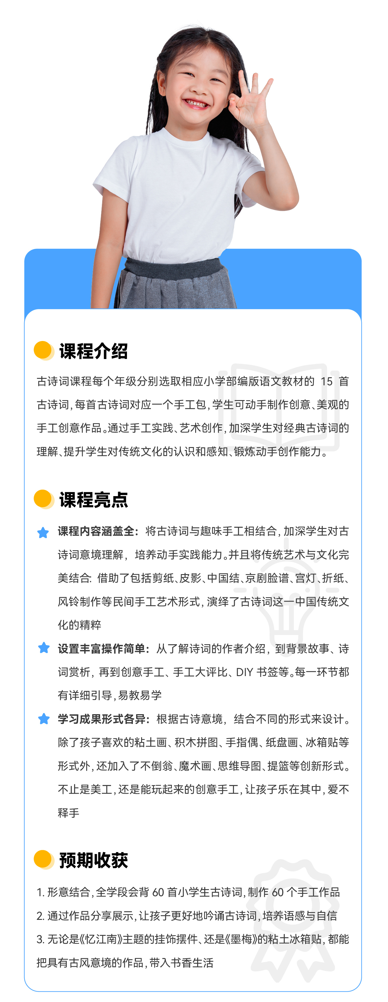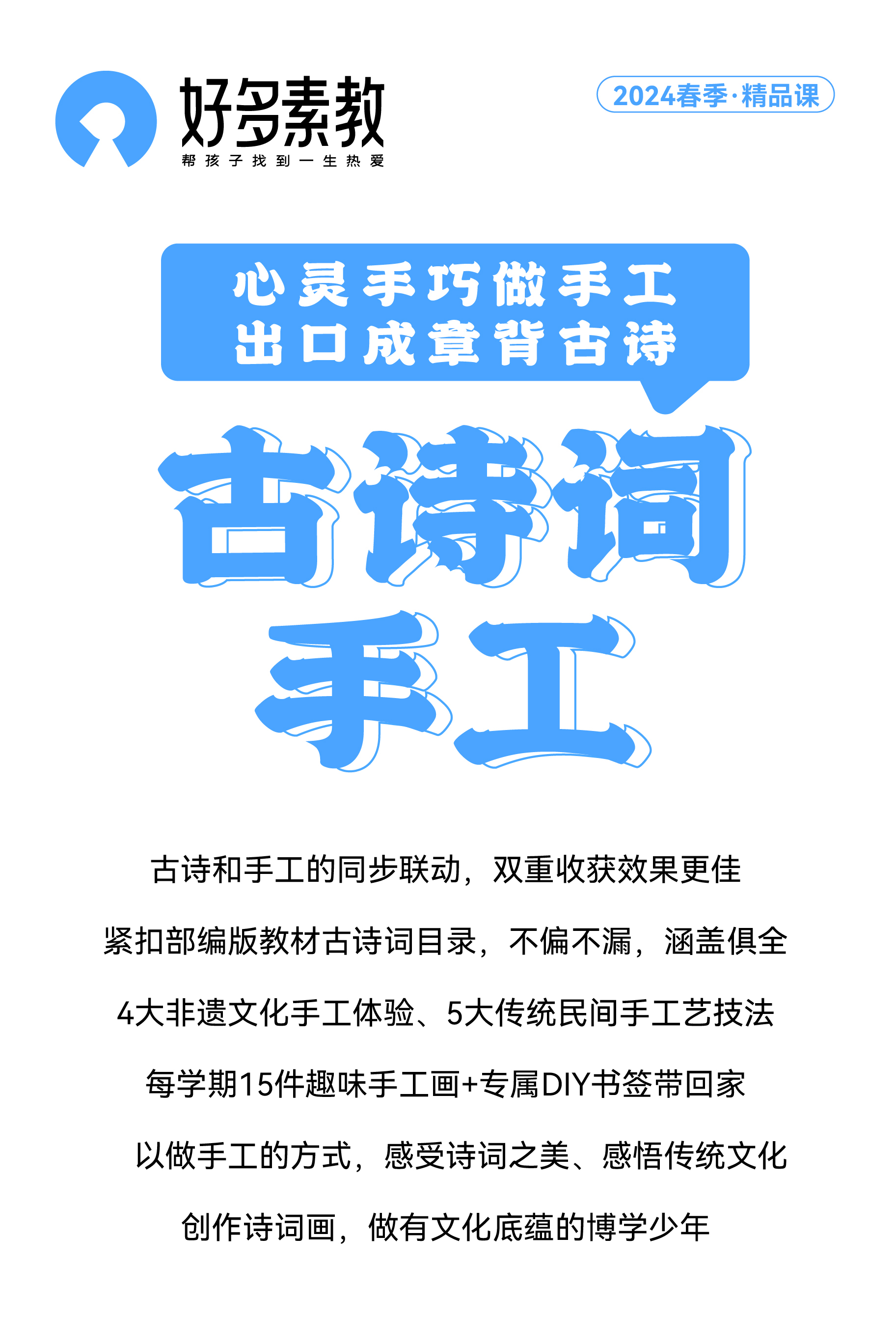 古诗和手工的同步联动,双重收获效果更佳,课程紧扣部编版教材古诗词目录,不偏不漏,涵盖俱全。手工部分涉及:4大非遗文化手工体验、5大传统民间手工艺技法,每学期15件趣味手工画+专属DIY书签带回家。以做手工的方式,感受诗词之美、感悟传统文化;创作有诗意的创意画,做有文化底蕴的博学少年!