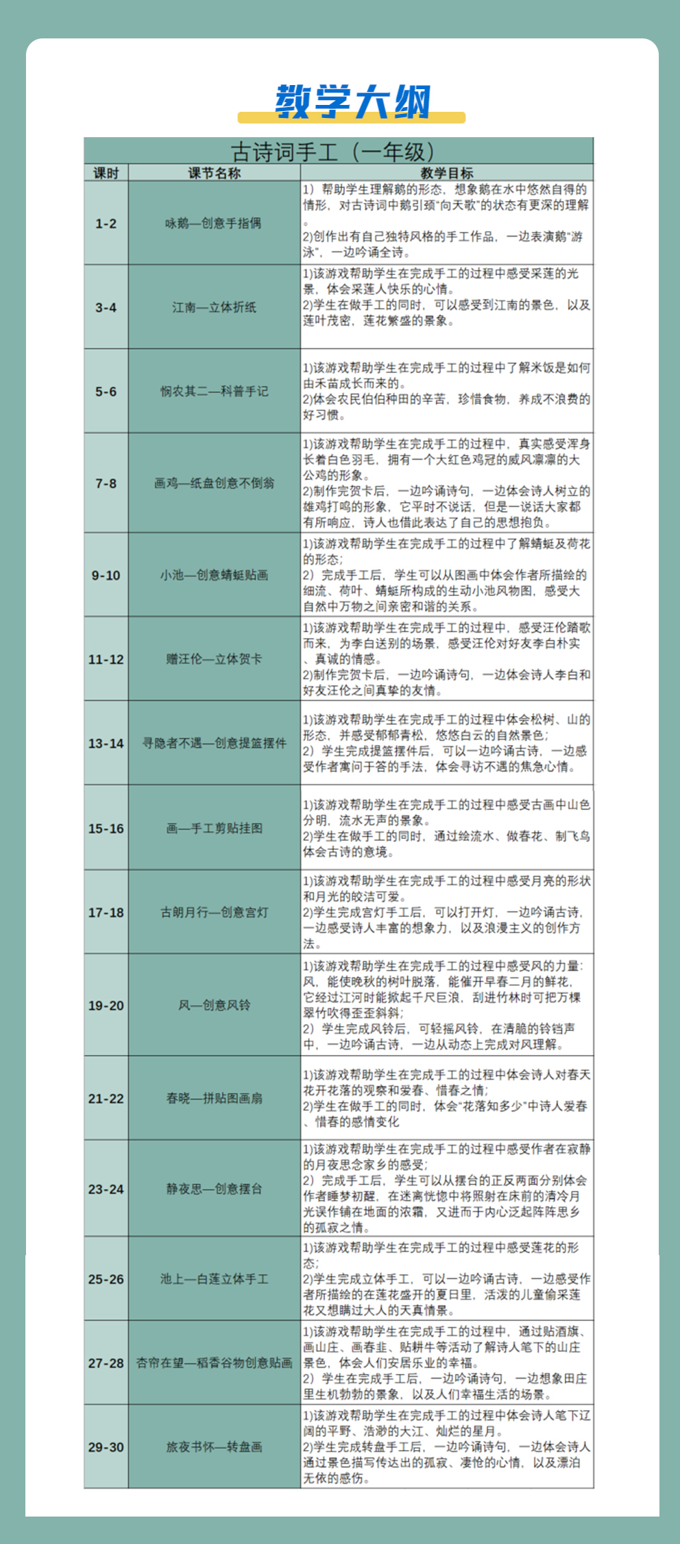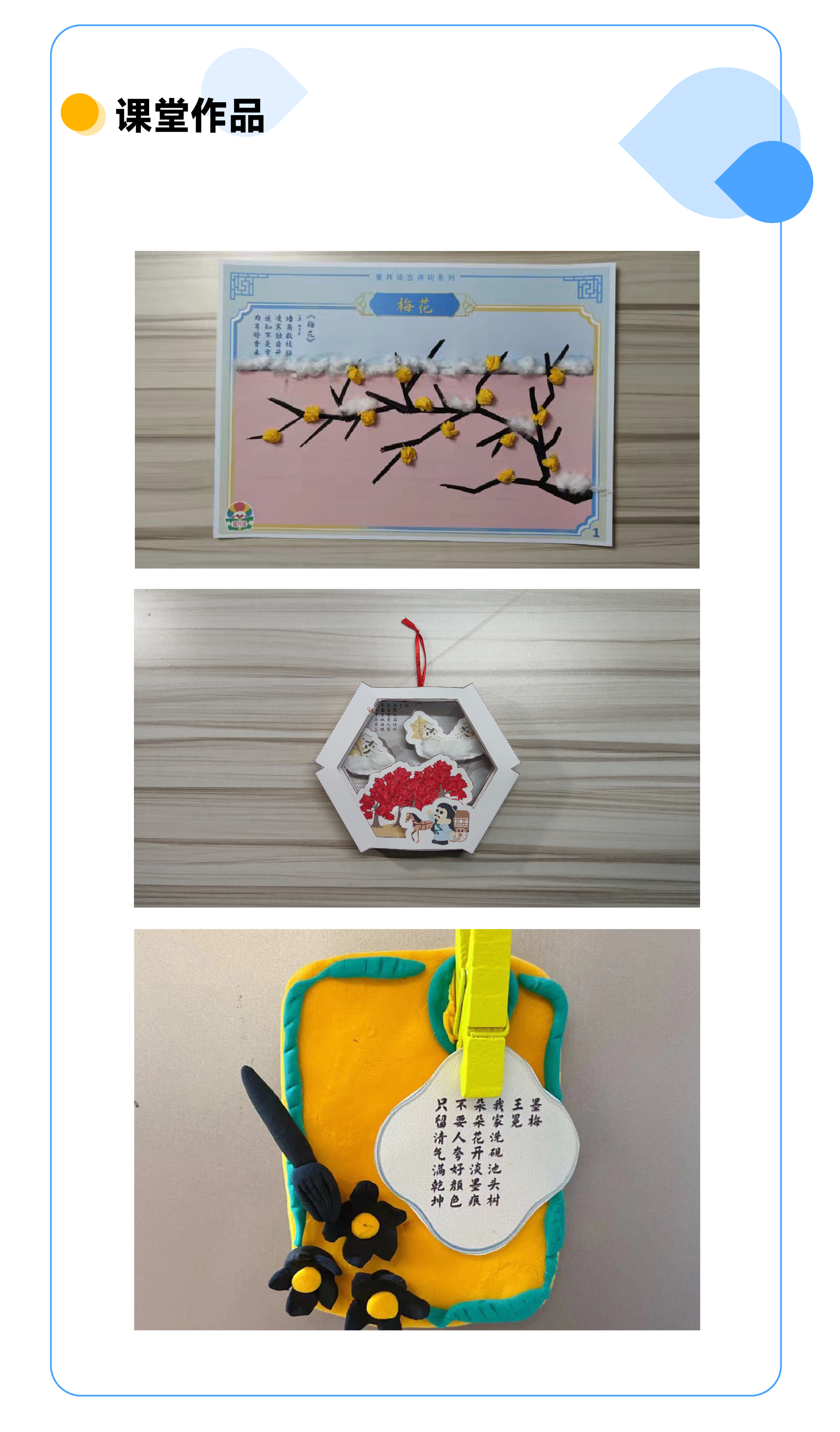 课程简介:古诗词系列素养课程,每个年级分别选取相应小学部编版语文教材的15首古诗词,通过手工实践、艺术创作15件古诗词手工作品,加深学生对经典古诗词的理解、提升学生对传统文化的认识和感知、锻炼动手创作能力。