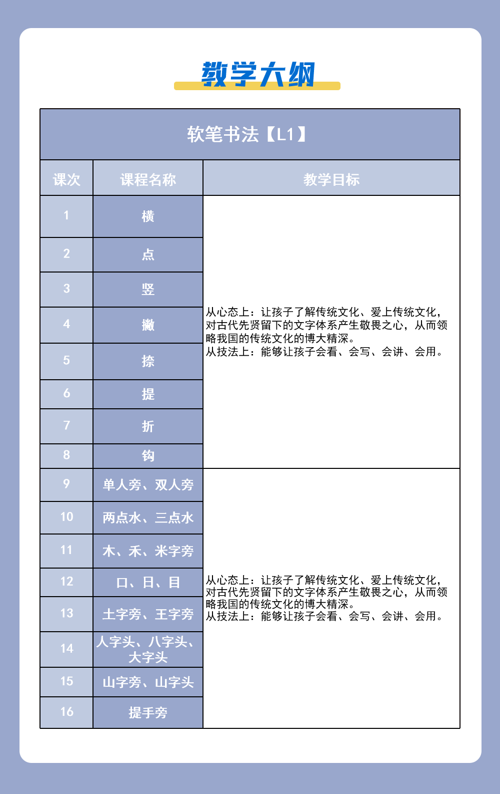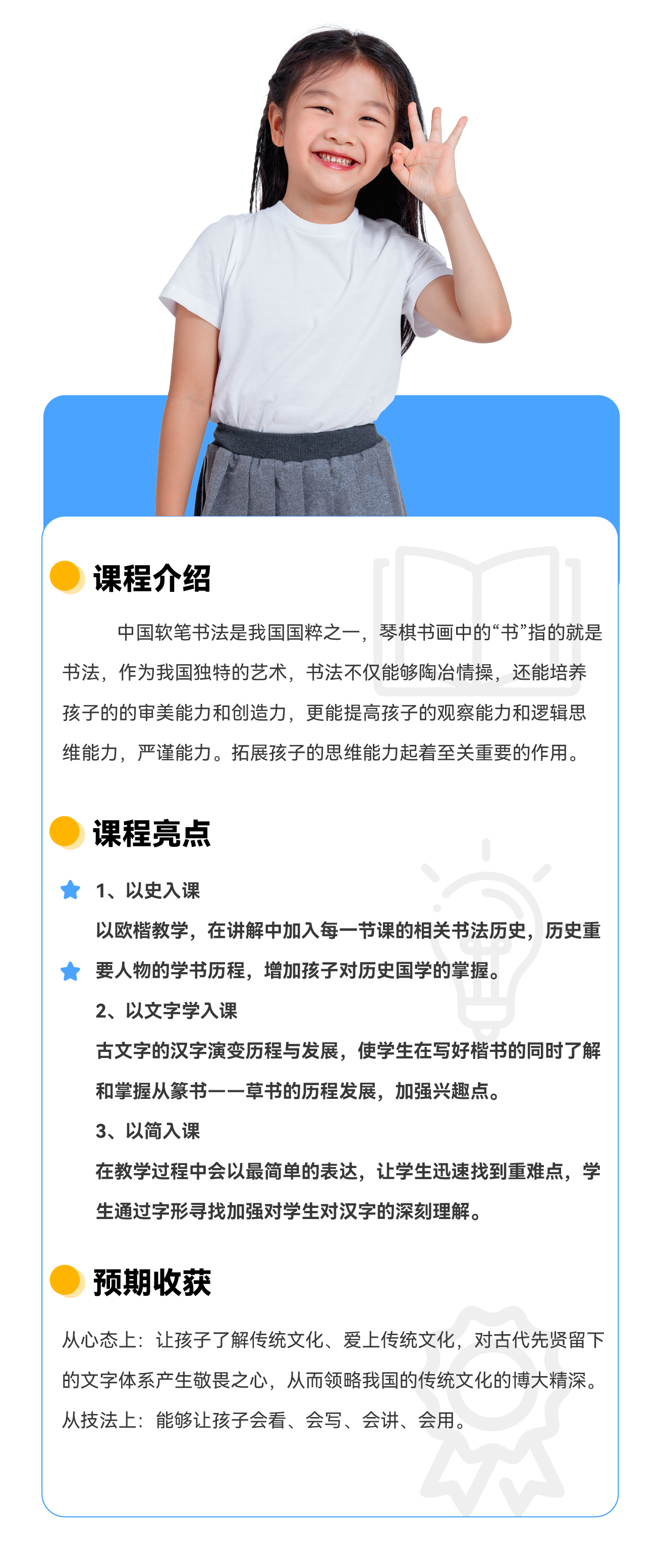 课程简介:中国软笔书法是我国国粹之一,琴棋书画中的“书”指的就是书法,作为我国独特的艺术,书法不仅能够陶冶情操,还能培养孩子的的审美能力和创造力,更能提高孩子的观察能力和逻辑思维能力,严谨能力。