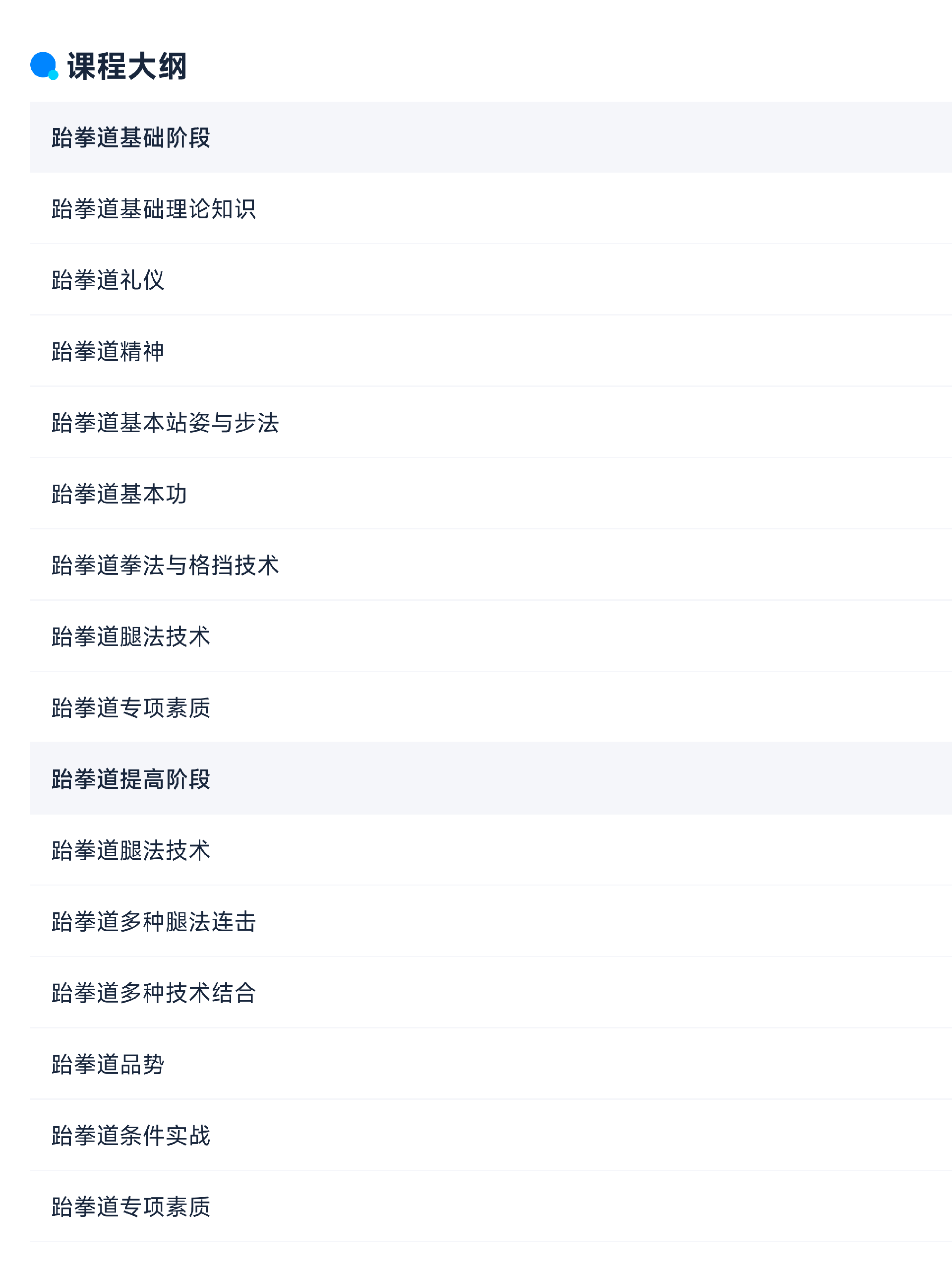 课程简介:跆拳道是起源于朝鲜半岛的优秀技击术,以其独特的风格和美丽风靡全世界。课程采取分层式教学,分为基础班和提高班。基础班主要教学内容有:跆拳道的基础理论知识、礼仪、跆拳道的精神、跆拳道的基本站姿与步法、跆拳