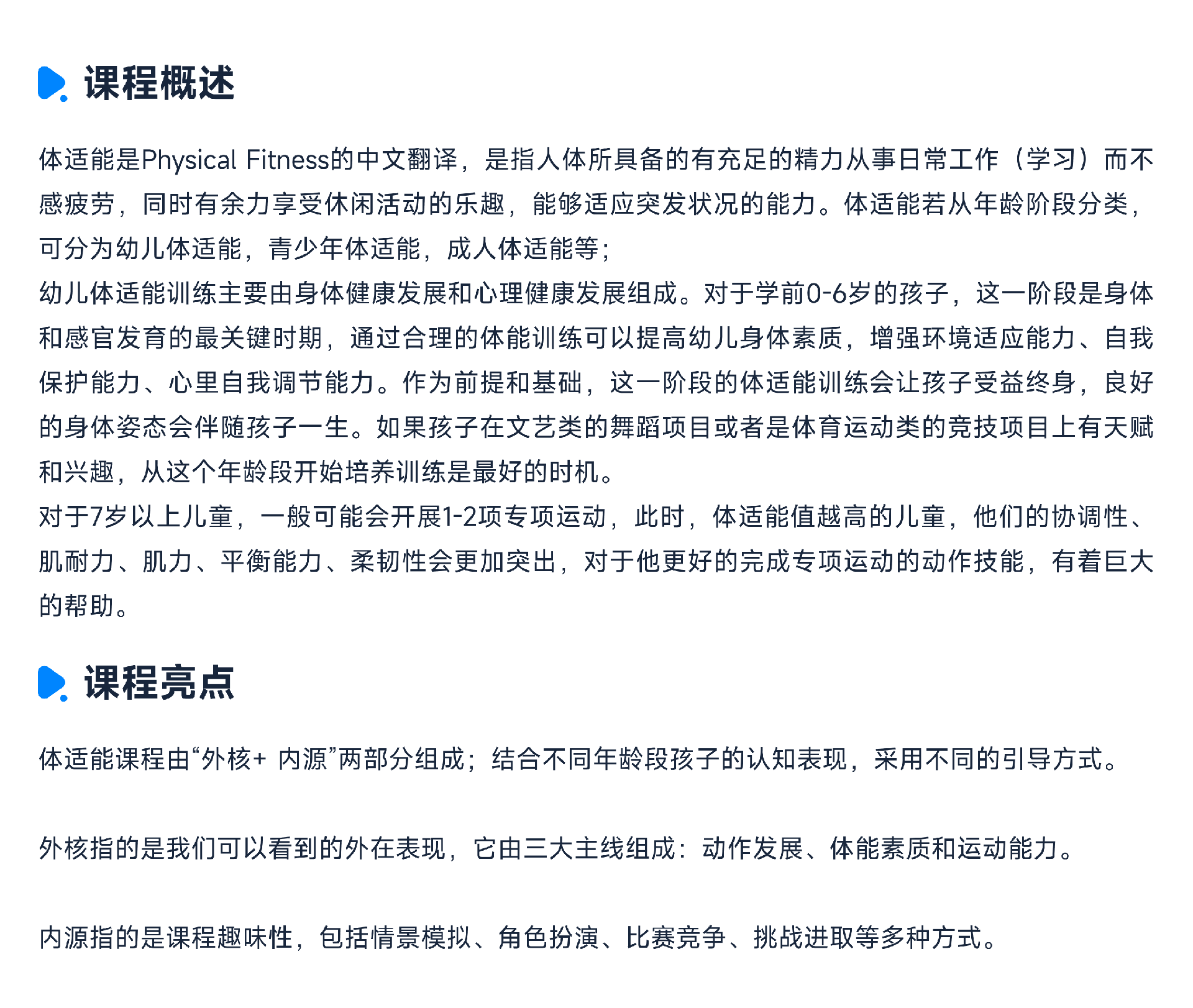 课程简介:体适能课程是一种综合性的运动课程,旨在提升身体的健康与适应能力。该课程结合了有氧运动、力量训练、柔韧性训练和平衡训练等多种元素,通过不同的运动方式和训练方法,全面提高身体的功能性能力。
