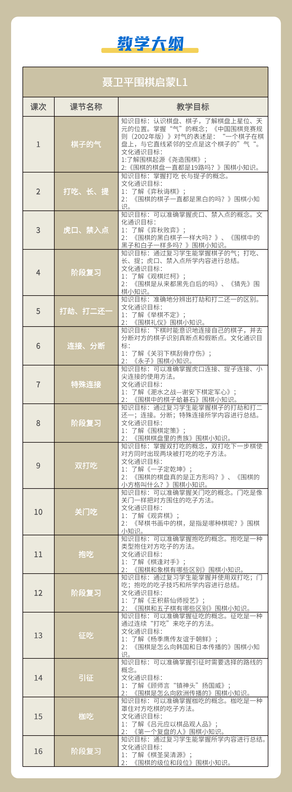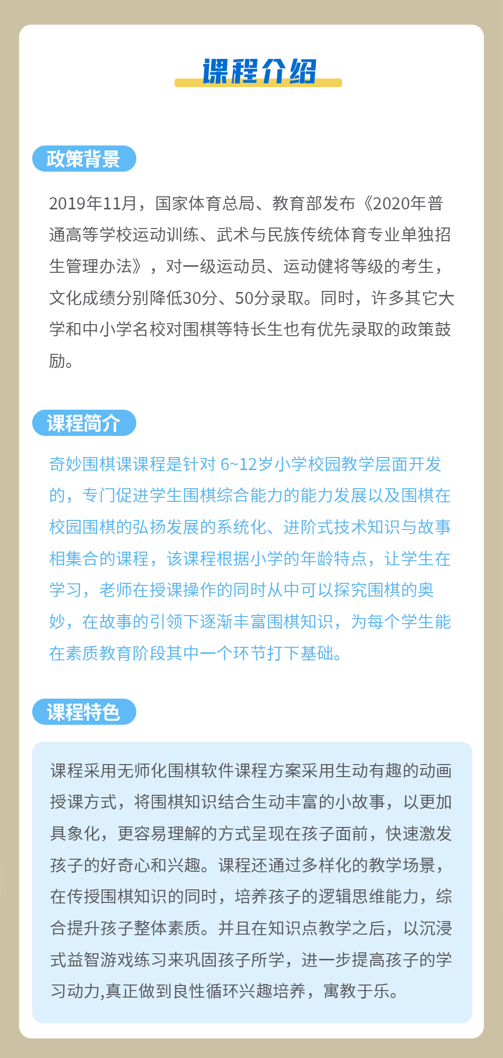 课程简介:奇妙围棋课课程是针对 6~12岁小学校园教学层面开发的,专门促进学生围棋综合能力的能力发展以及围棋在校园围棋的弘扬发展的系统化、进阶式技术知识与故事相集合的课程。