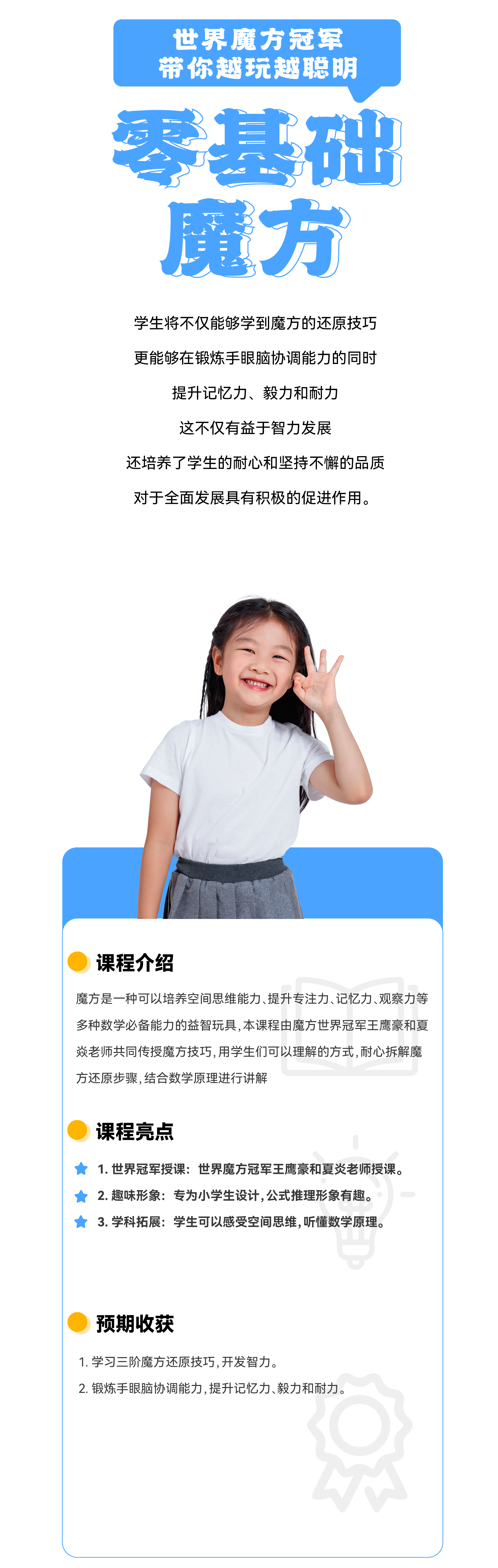 课程简介:魔方是一种可以培养空间思维能力、提升专注力、记忆力、观察力等多种数学必备能力的益智玩具,本课程由魔方世界冠军王鹰豪和夏焱老师共同传授魔方技巧,用学生们可以理解的方式,耐心拆解魔方还原步骤,结合数学原理